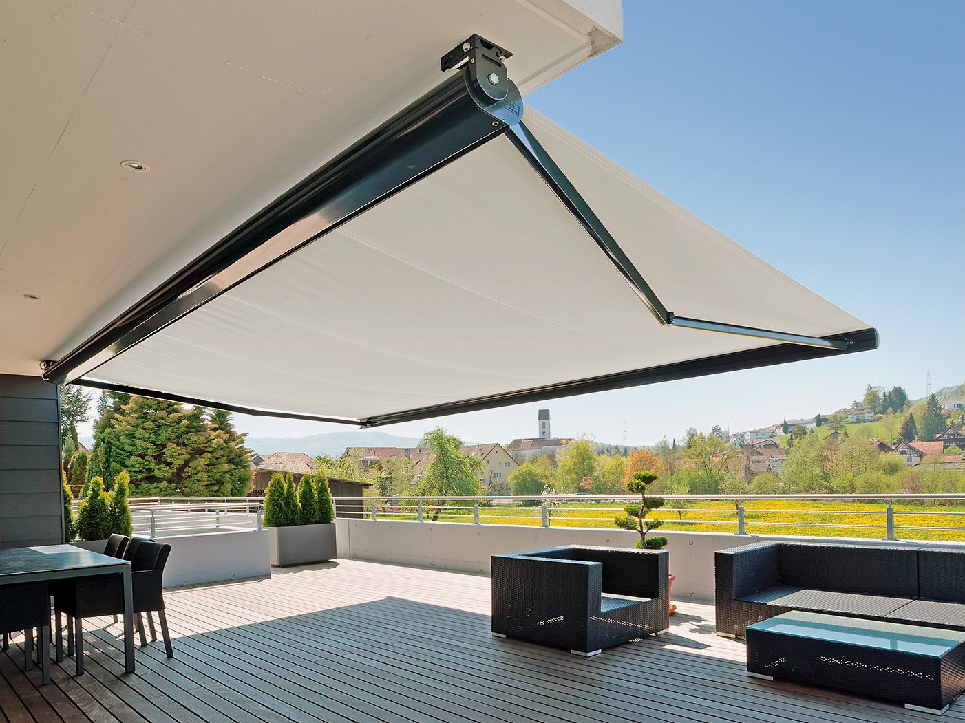 Sunshade textiles are high performance products. They combine aesthetics with high tech and functionality. The technical textiles used are particularly sturdy, UV certified and enjoy a very long service life. This notwithstanding, there may be times when the dirt sticks to the fabric tarnishing its pristine, new look. Awnings can get dirty quickly or slowly depending on the weather. That is why you should always retract the awning in strong winds and before every downpour, at the latest. You should also regularly clear away any leaves and dust off the awning fabric. A thorough clean is also recommended once a year as a minimum. This will safeguard its overall aesthetic look and protective properties.