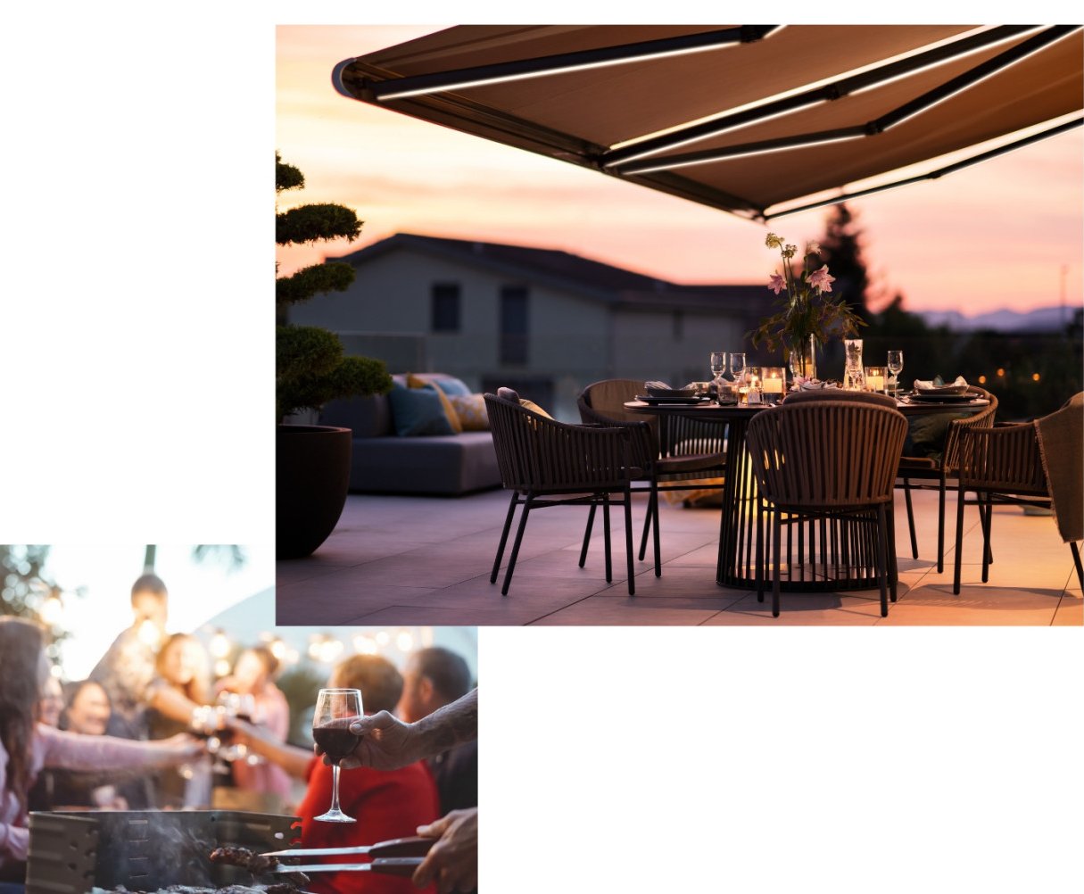 Sun blinds and awnings protect balconies and terraces against the rays of the sun and overheating. The awning fabric keeps out the UV rays and is designed for use outdoors making it weather-resistant. Schenker Storen models, however, have long offered more than just protection against the effects of the weather and UV rays. They can be fitted with specific features on request. For example, dimmable LED lighting is integrated in the underside of the cubic cassette awning KKM 7’s cassette. In the case of the award-winning KGM 6+, the dimmable LED light source is built into the articulated arms. You can continue to relax on your terrace in a softly lit atmosphere during the summer nights, even after the sun has set.