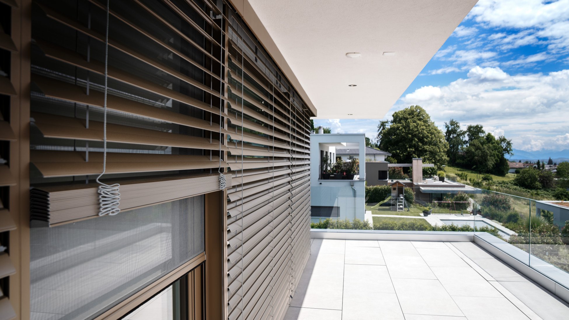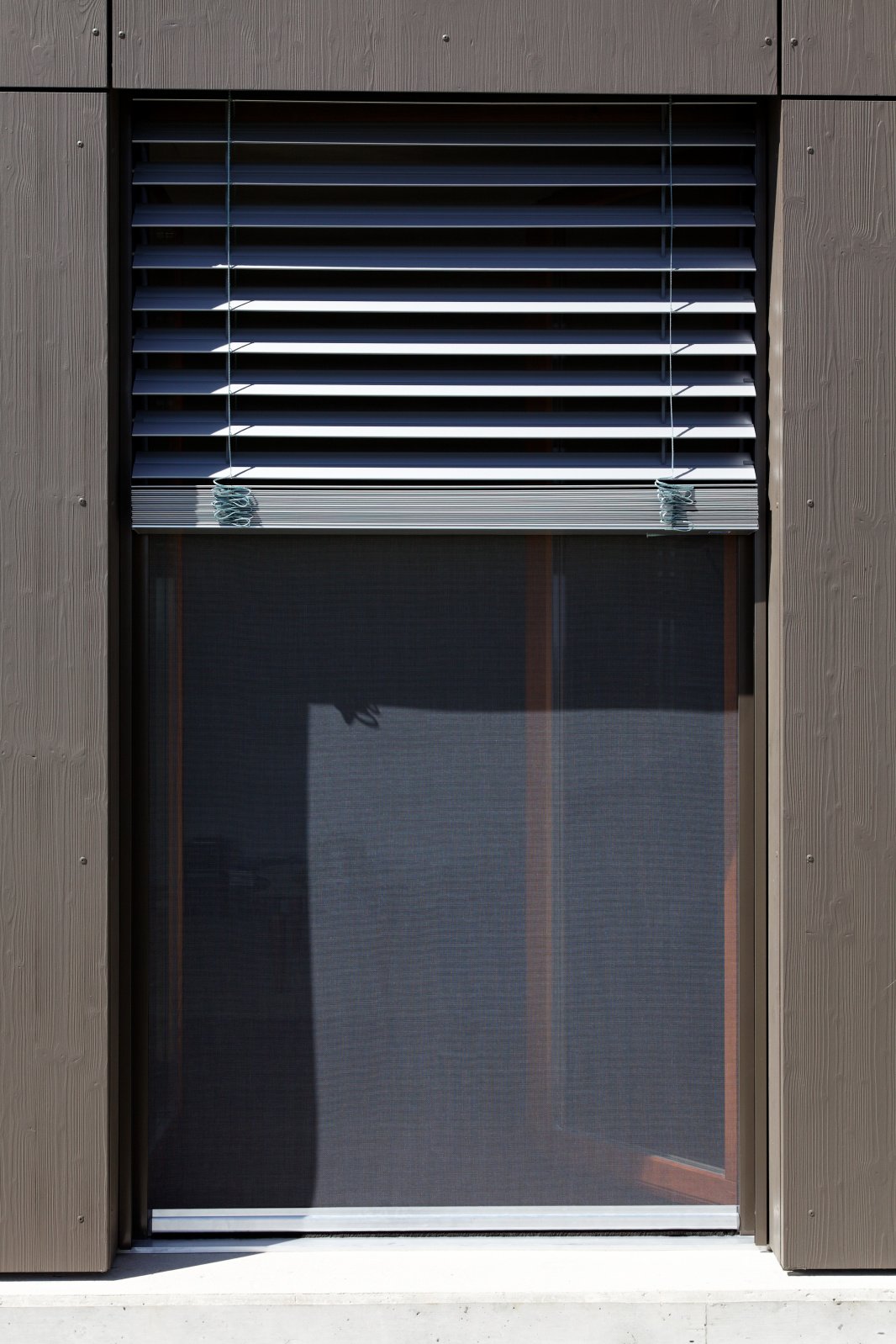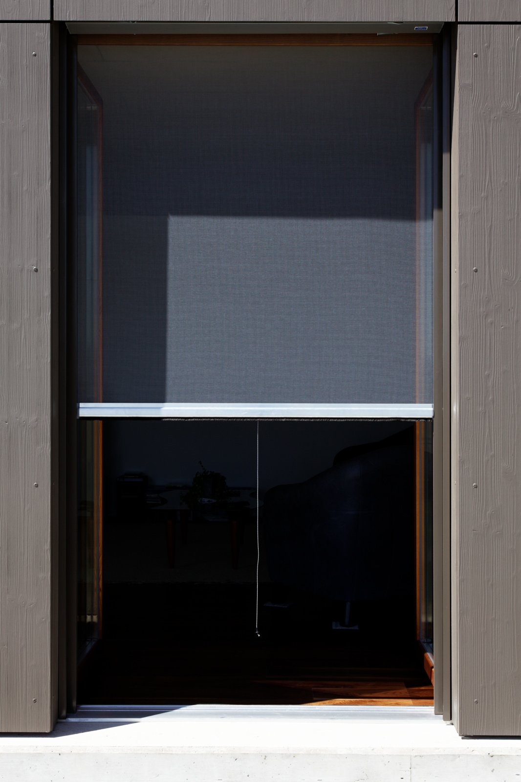The ISR 48, made from grey plastic-coated fibreglass thread, is a compact vertical fabric blind for new buildings and renovations, and is very appealing thanks to its high level of air permeability and the fact that it is easy to clean. Its elegant guide profile fits in beautifully with modern architectural styles and ensures a high level of insect protection thanks to the retracted brush. At the customer’s request, the guides and fabric rod can be powder coated in a colour to match the blind or window shutters, or colourless anodised. It slides quietly and securely on the continuous guide made from extruded aluminium. Its service and maintenance-friendly design is easy to look after and weather resistant.