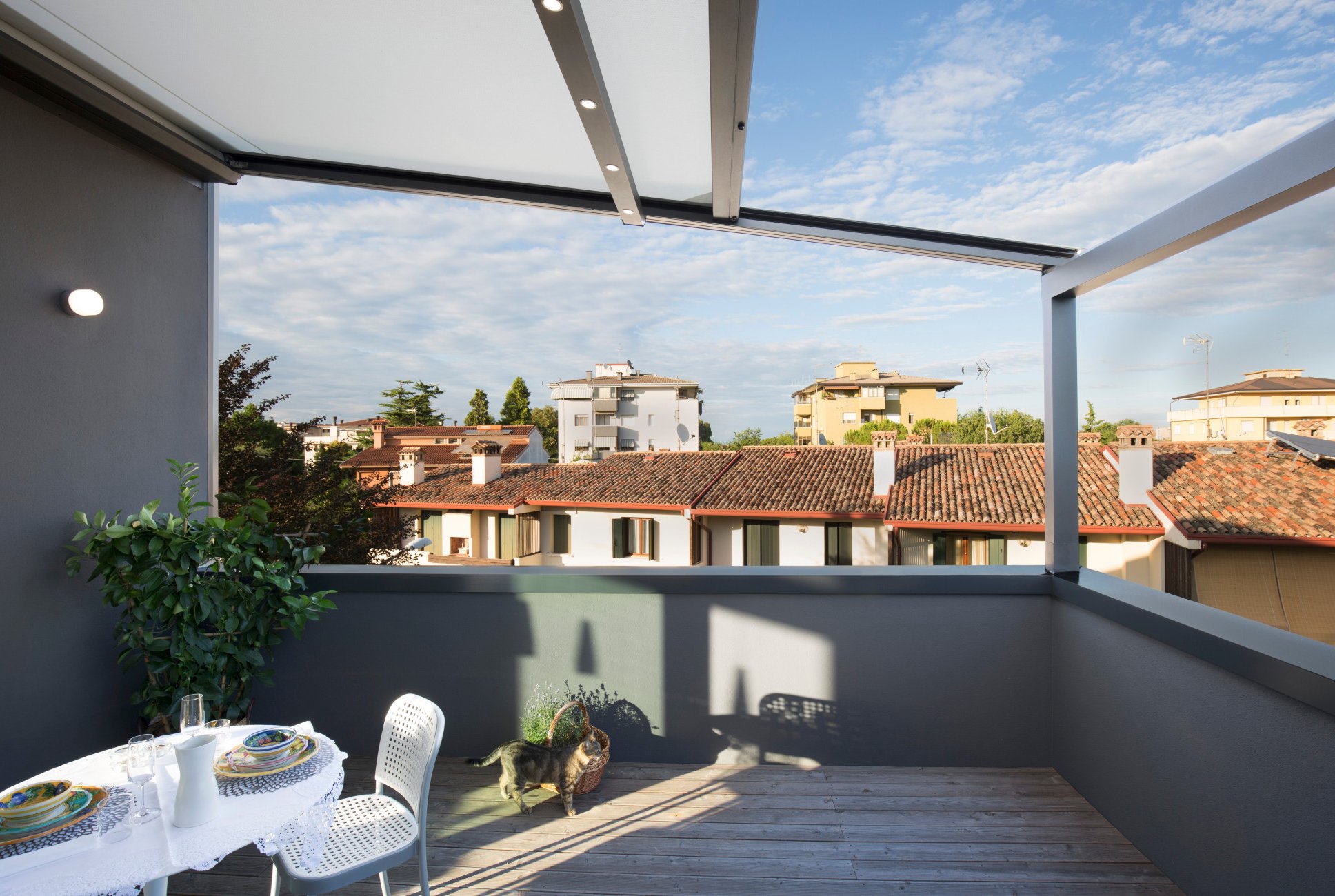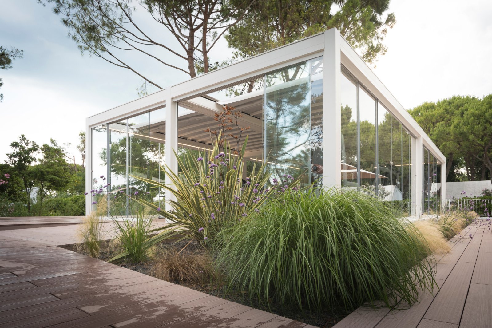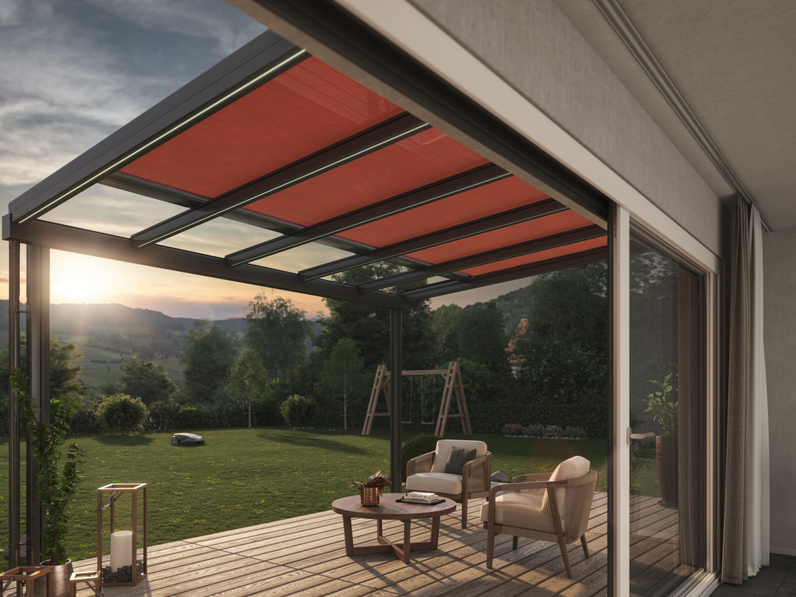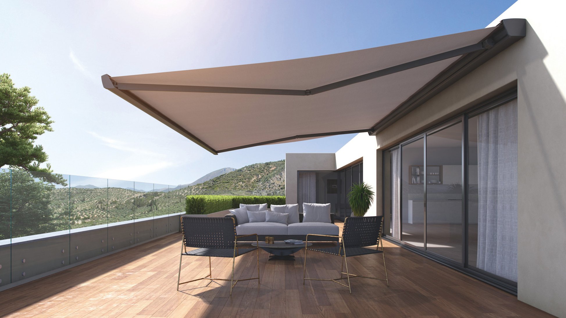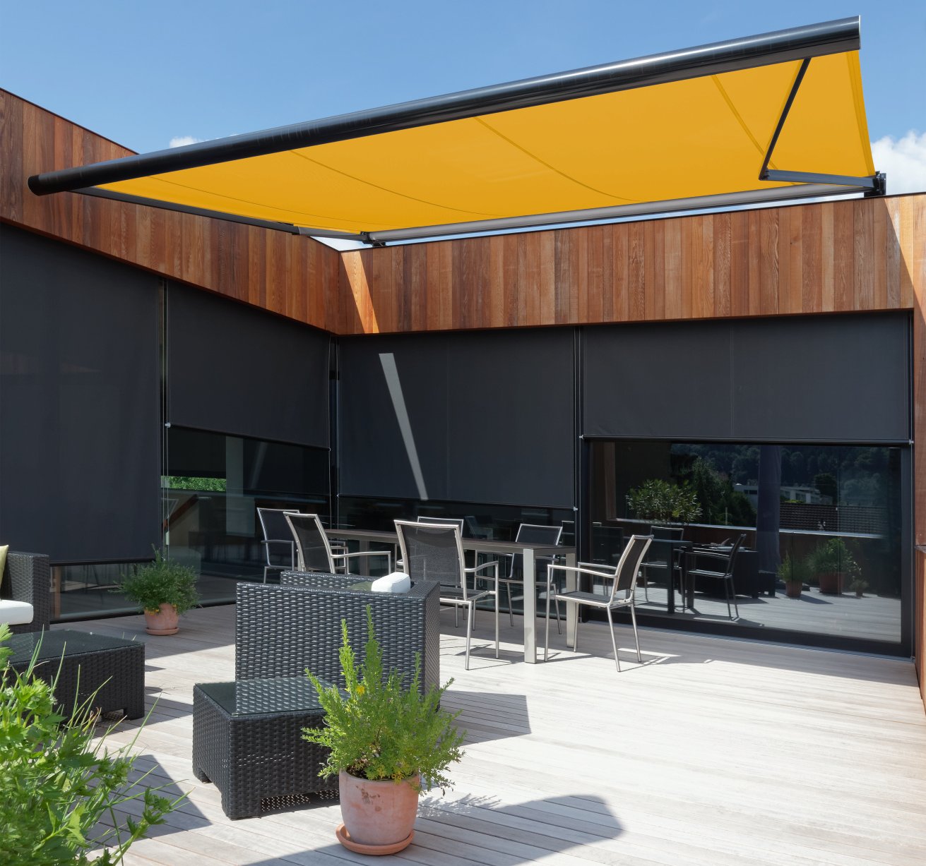 The requirements on terraces and house fronts are more complex, and they also need bigger projections. An articulated-arm awning makes for a high-quality standard solution. Measuring up to 20 metres wide, it offers the best sun shading and, depending on the width, its two to eight hinged arms ensure maximum stability and perfect fabric tensioning. Articulated-arm awnings are a flexible solution for terraces, large garden seating areas and commercial buildings. They are also ideal for remodelling projects since the fixing points on the wall and ceiling can be selected relatively flexibly. Enclosed solutions in different price brackets offer protection against the effects of the weather. If it’s comfort and aesthetics you’re after, the premium level options offer countless technically sophisticated features and design variants to meet specific requirements.