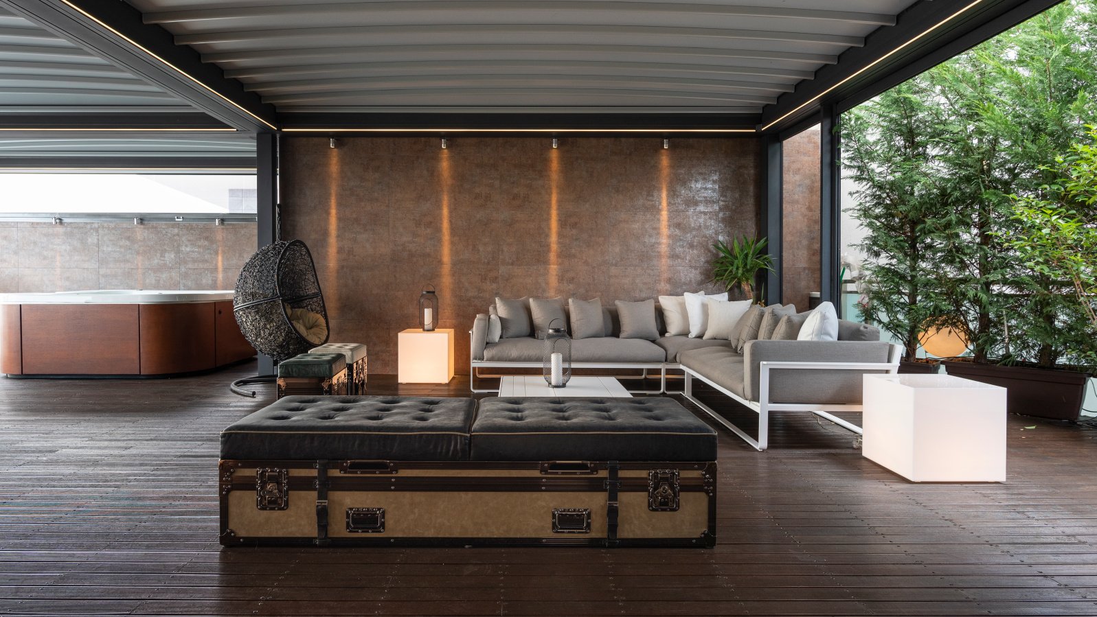 The Zip-Pergola can be set up with a projection of up to 7 metres. Its lattice design will even shield large terraces from the sun and rain. This water-repellent Pergola with two external supports can be extended with side modules. Wind resistance up to Class 6. Dimmable LED lighting on the inside of the system.