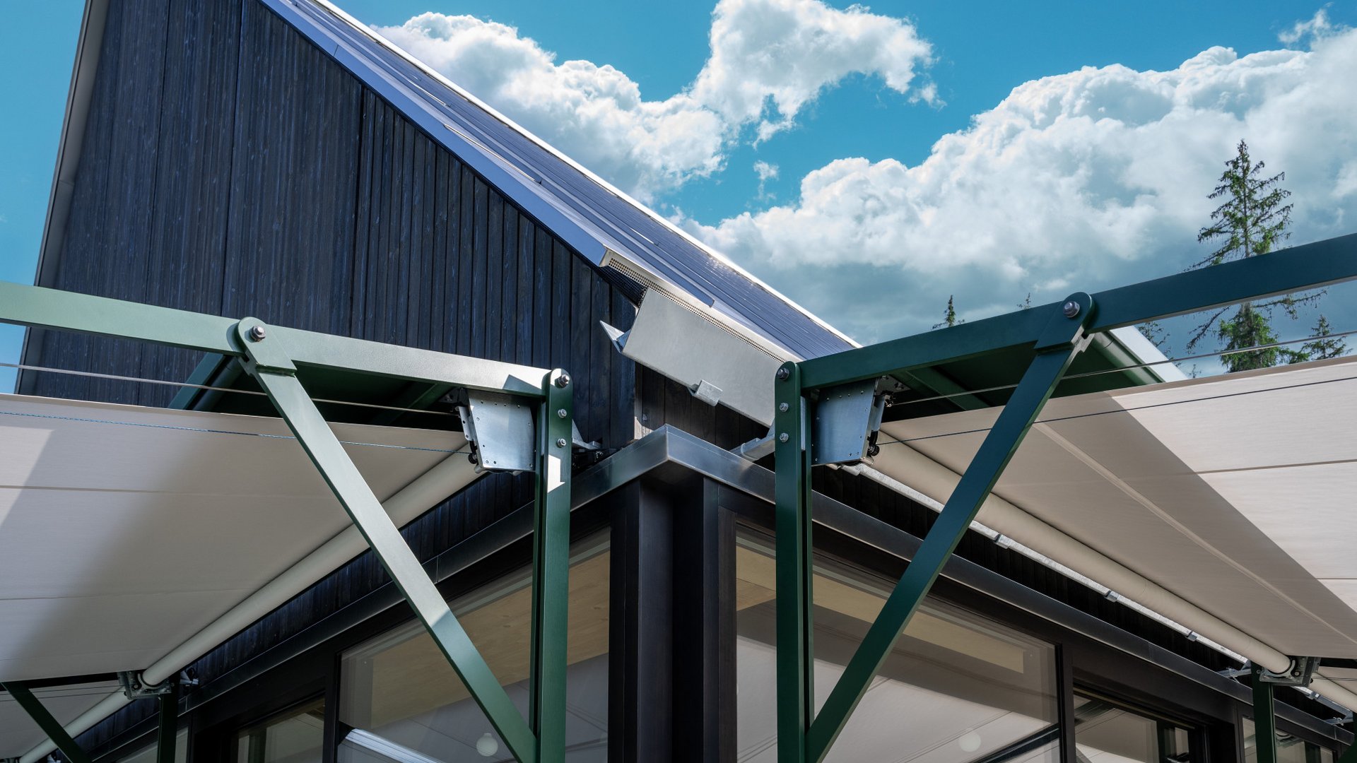 To ensure the building can operate throughout the year, the façade incorporates folding and sliding elements. These features create a fluid transition between indoor and outdoor spaces and allow for flexible adaptation to seasonal demands and changing weather conditions. Shading plays a key role here, and Schenker Storen was commissioned to develop a suitable solution. The aim was to complement the building’s high-quality architecture while also supporting year-round use in an Alpine setting.