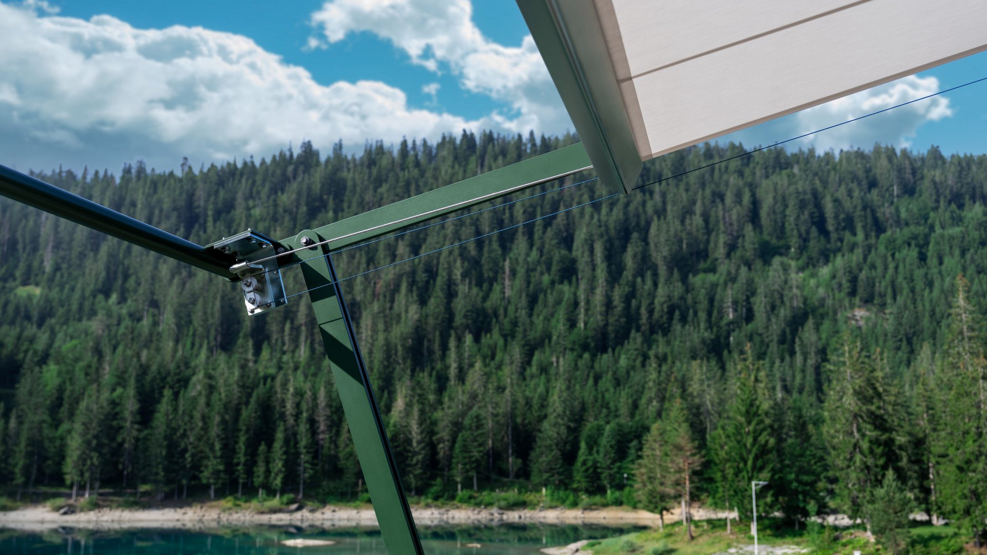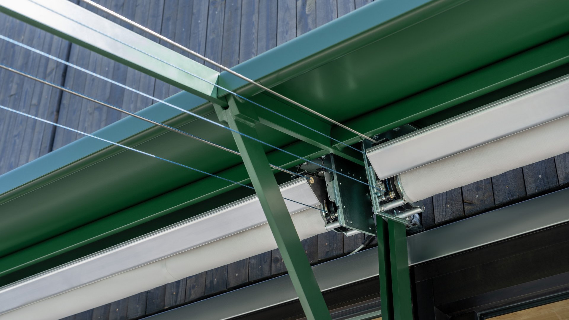Several factors were crucial in finding the right solution: The blind system had to be as discreet as possible to enhance the architectural design. For this reason, a frictionless cable system with slim guide elements was selected. At the same time, the restaurant operates all year round at an altitude of around 1,000 metres above sea level in the Flims high valley, where it is often exposed to severe weather. A counter-tension system was therefore preferred, along with wind-stable fabric with a covering made from premium “Elements Solids” acrylic fibre. The horizontally retractable system was installed onto a substructure provided by the client, which was custom-built to match the dimensions of the blind system.
