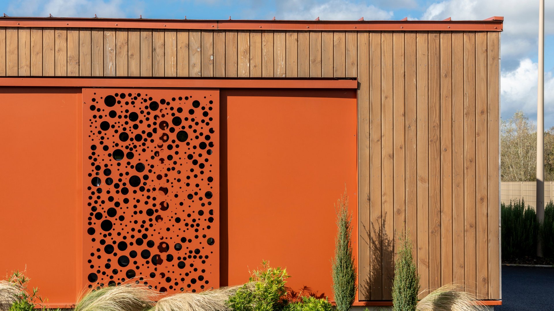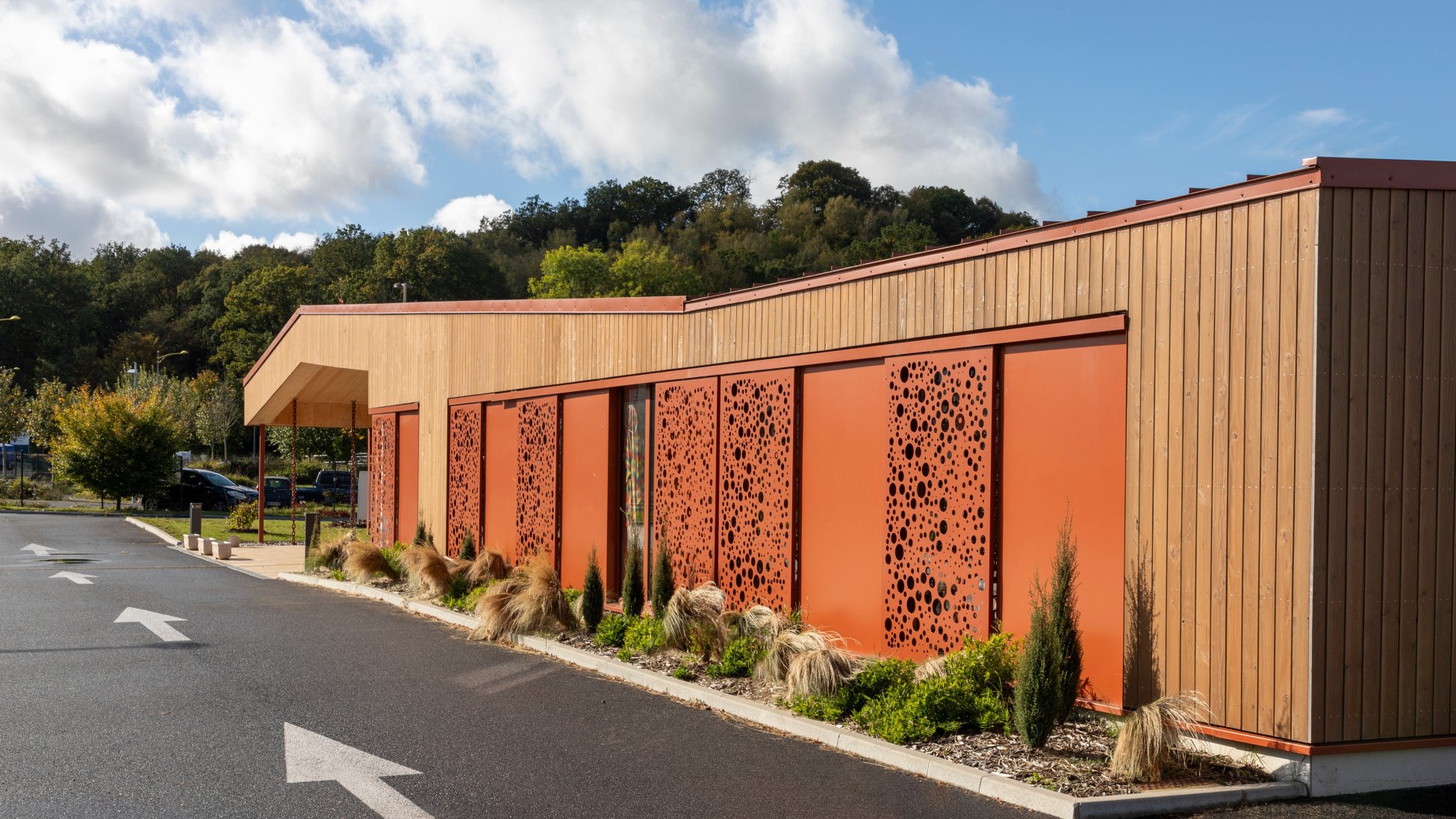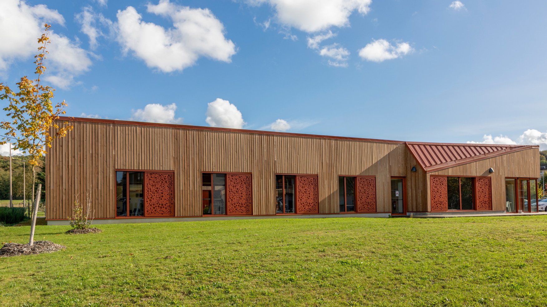 Drawing inspiration from the concept of a central courtyard, the day clinic situated in the Oise department of France captivates with its generous use of space, natural light, and the unique connections between its rooms. The unmistakable focal point of the facade lies in the custom-made aluminium shutters, not only providing sun protection but also creating sophisticated lighting effects within the clinic. These shutters seamlessly integrate into the architecture, elegantly reconciling apparent opposites such as form and function, and comfort and efficiency. The building’s structure is a harmonious blend of wooden elements, including solid wood slats made of cross-laminated timber (CLT) for load-bearing partition walls, traditional wooden framework for the facades, and solid CLT boxes for the roof panels.