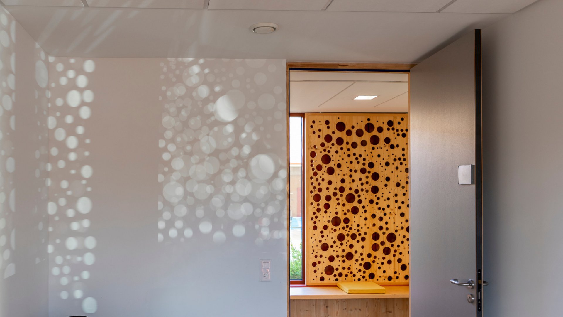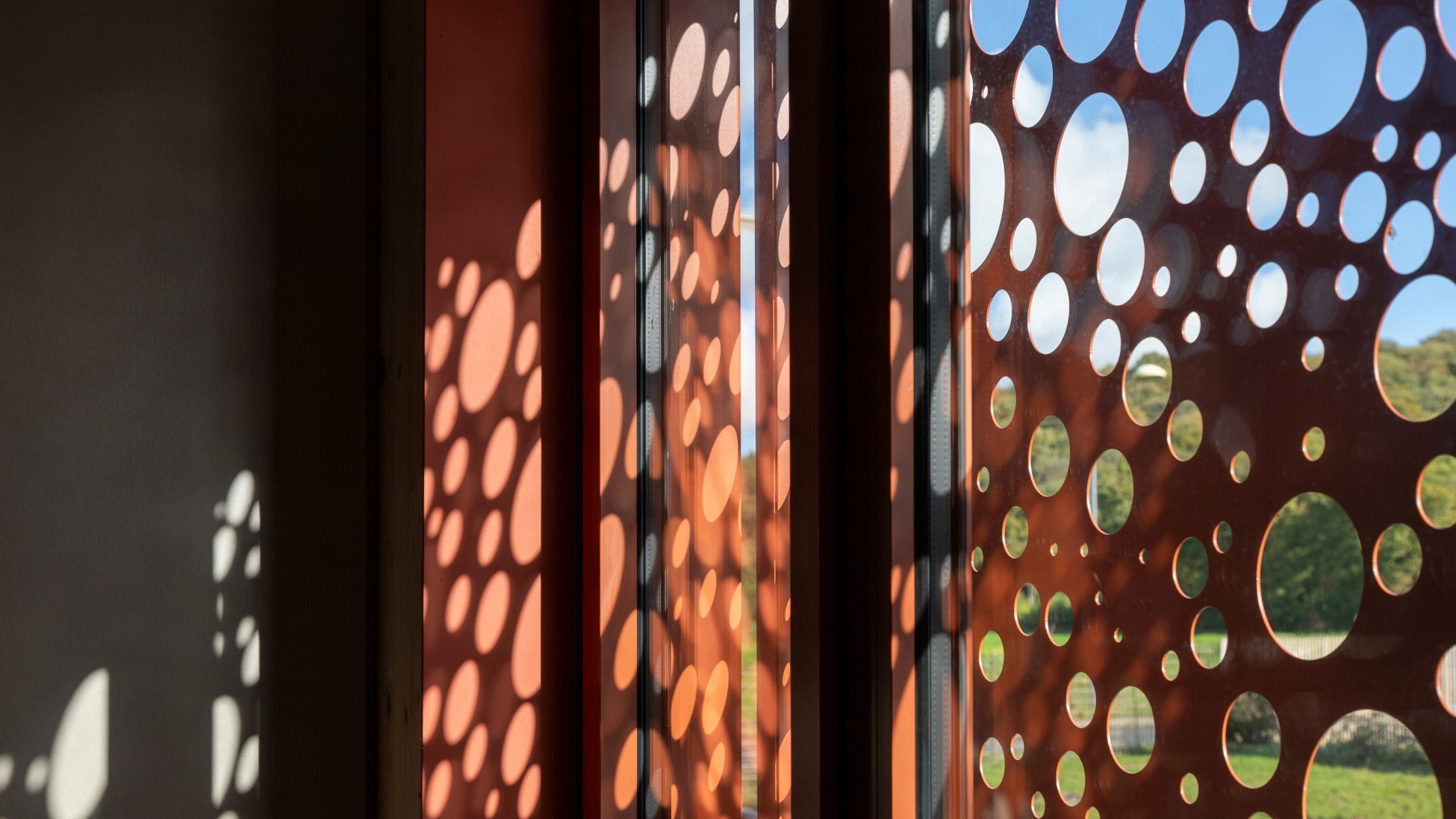 The sliding shutters play a pivotal role in defining the character of the building, becoming an essential part of the day clinic’s visual and architectural identity. Specifically designed for this project, their unique pattern, featuring randomly arranged circles, adds a touch of artistic flair to the clinic’s facade, enriching the interior spaces with enchanting light patterns.