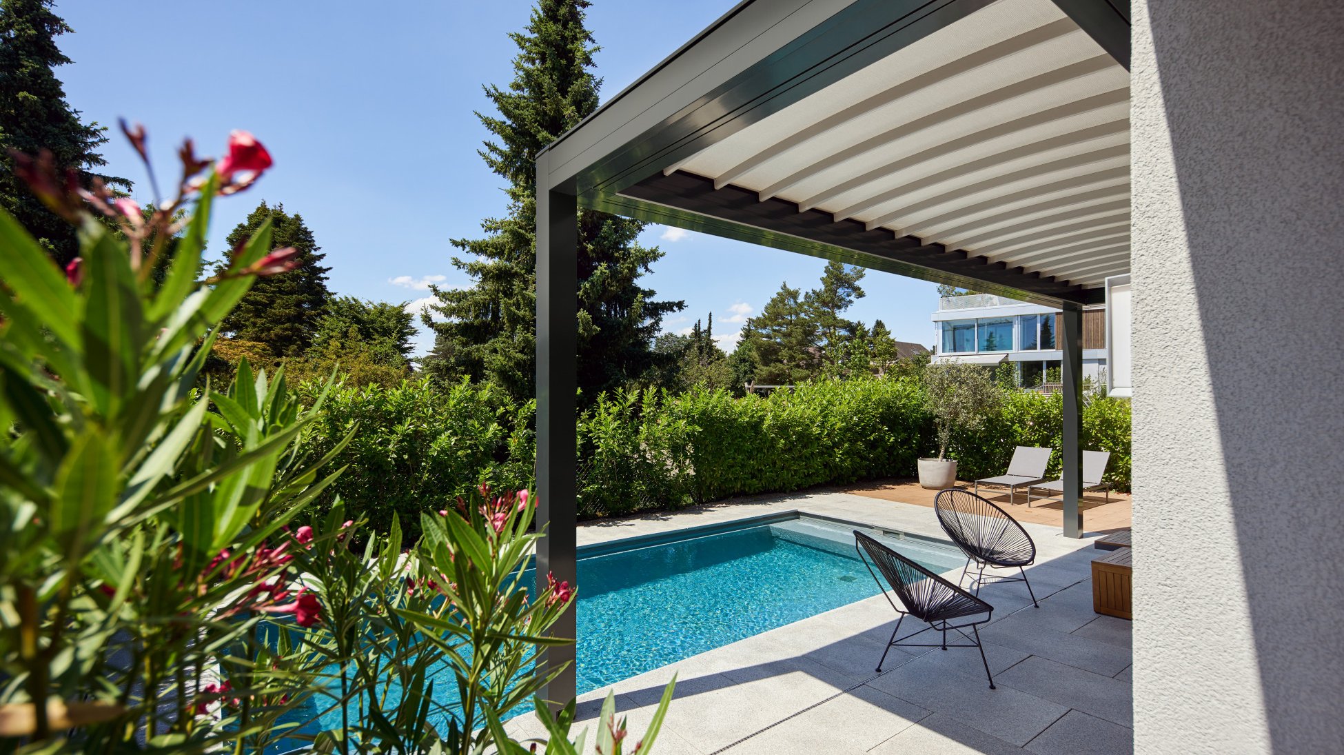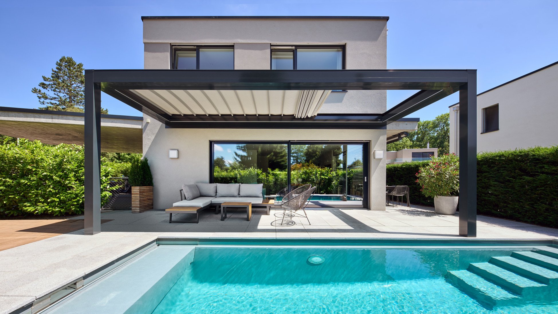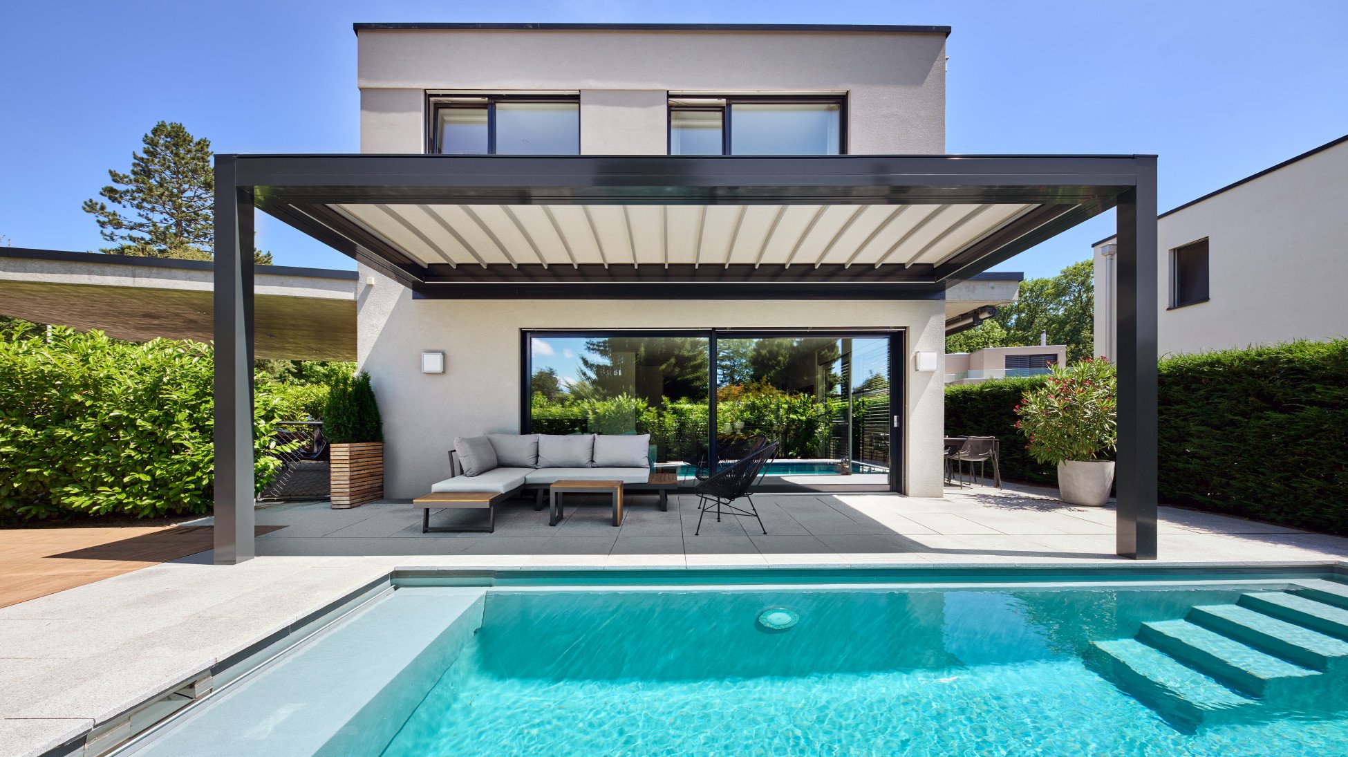 The owners have added an inviting lounge area on the sun-exposed south-west side of their modern single-family home. It looks directly over the water of the adjoining swimming pool. Because they enjoy spending time in the seating area, the family decided to install a sturdy, permanent roof solution that they could open and close depending on the weather, or even leave open for longer periods.