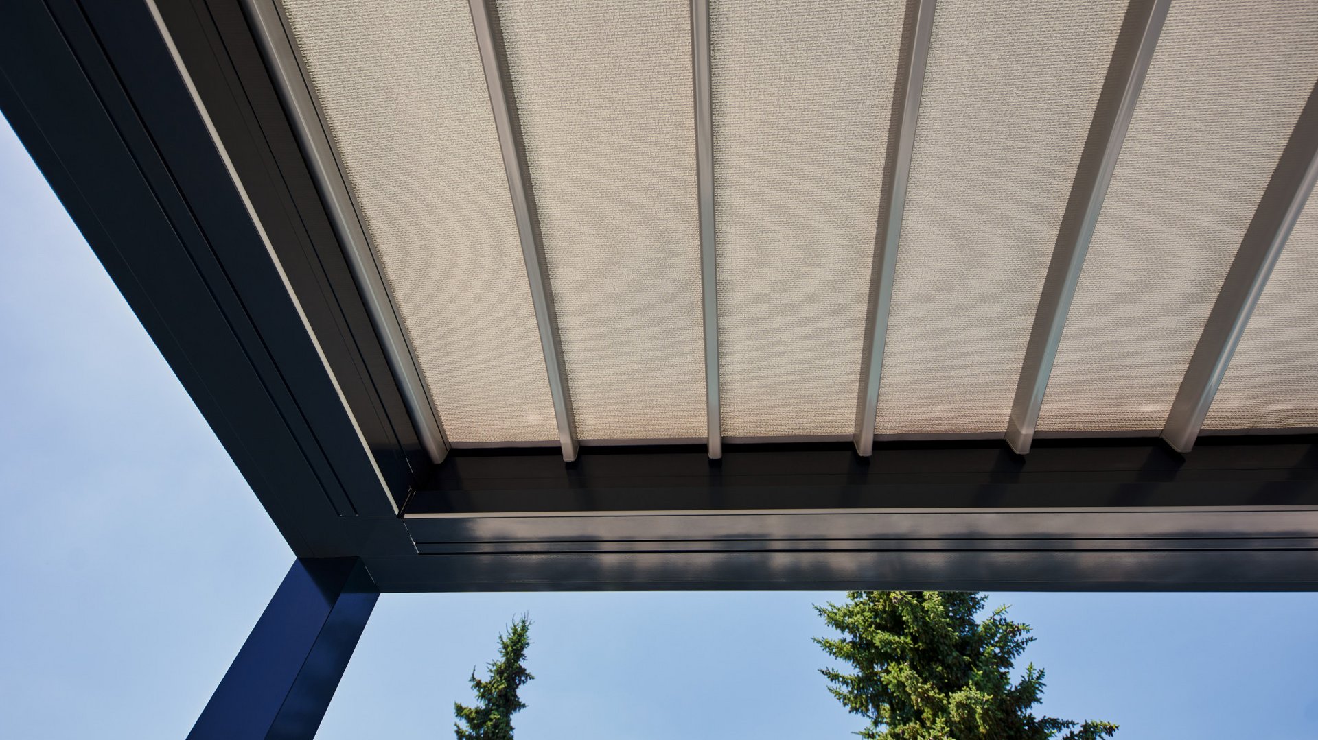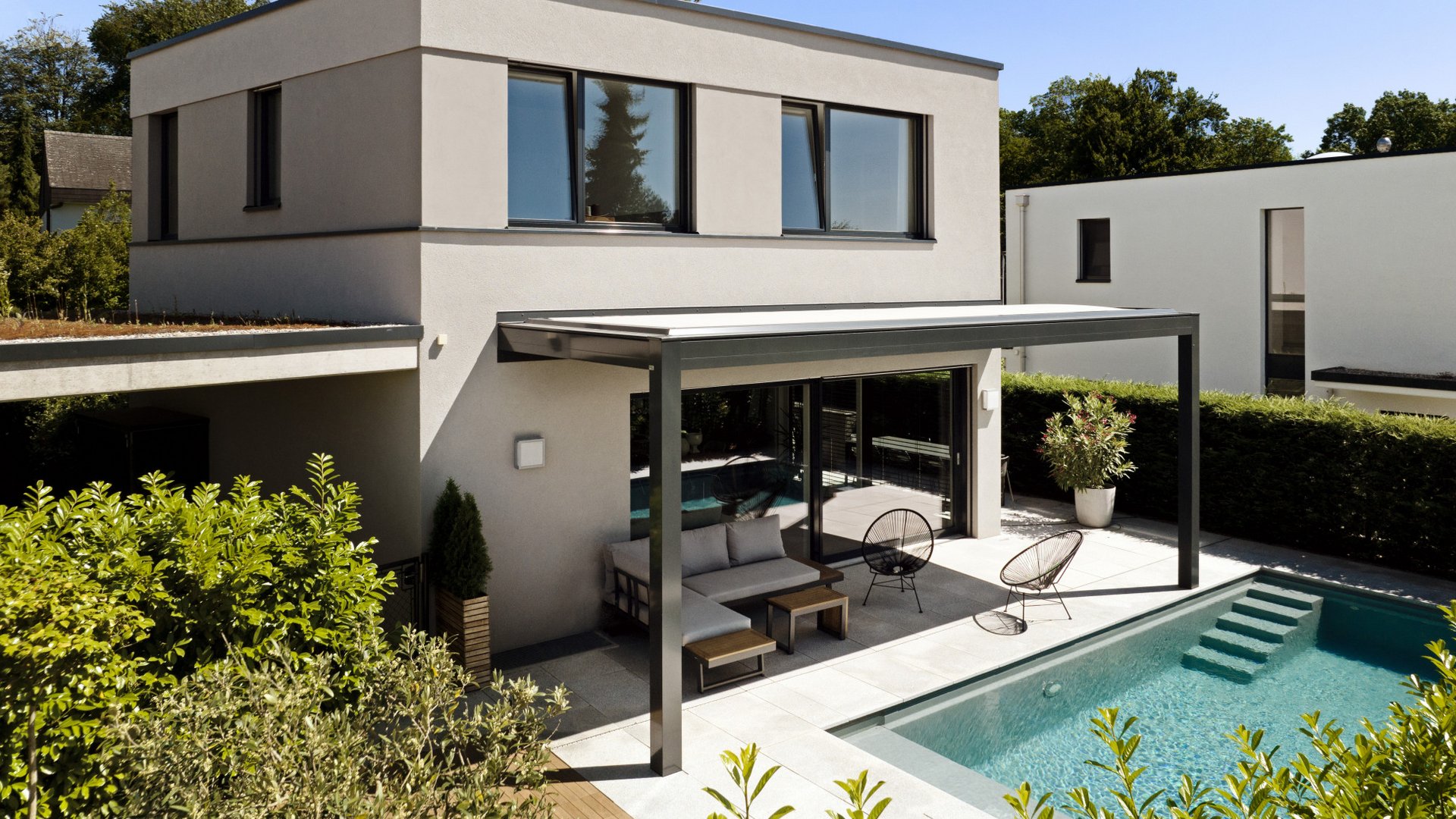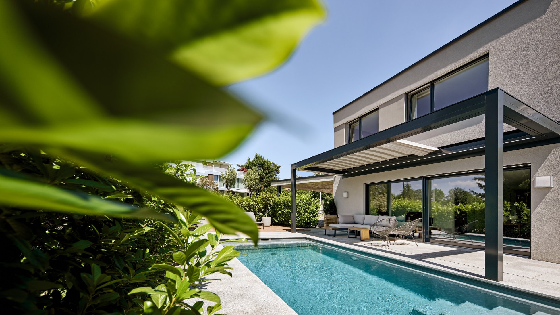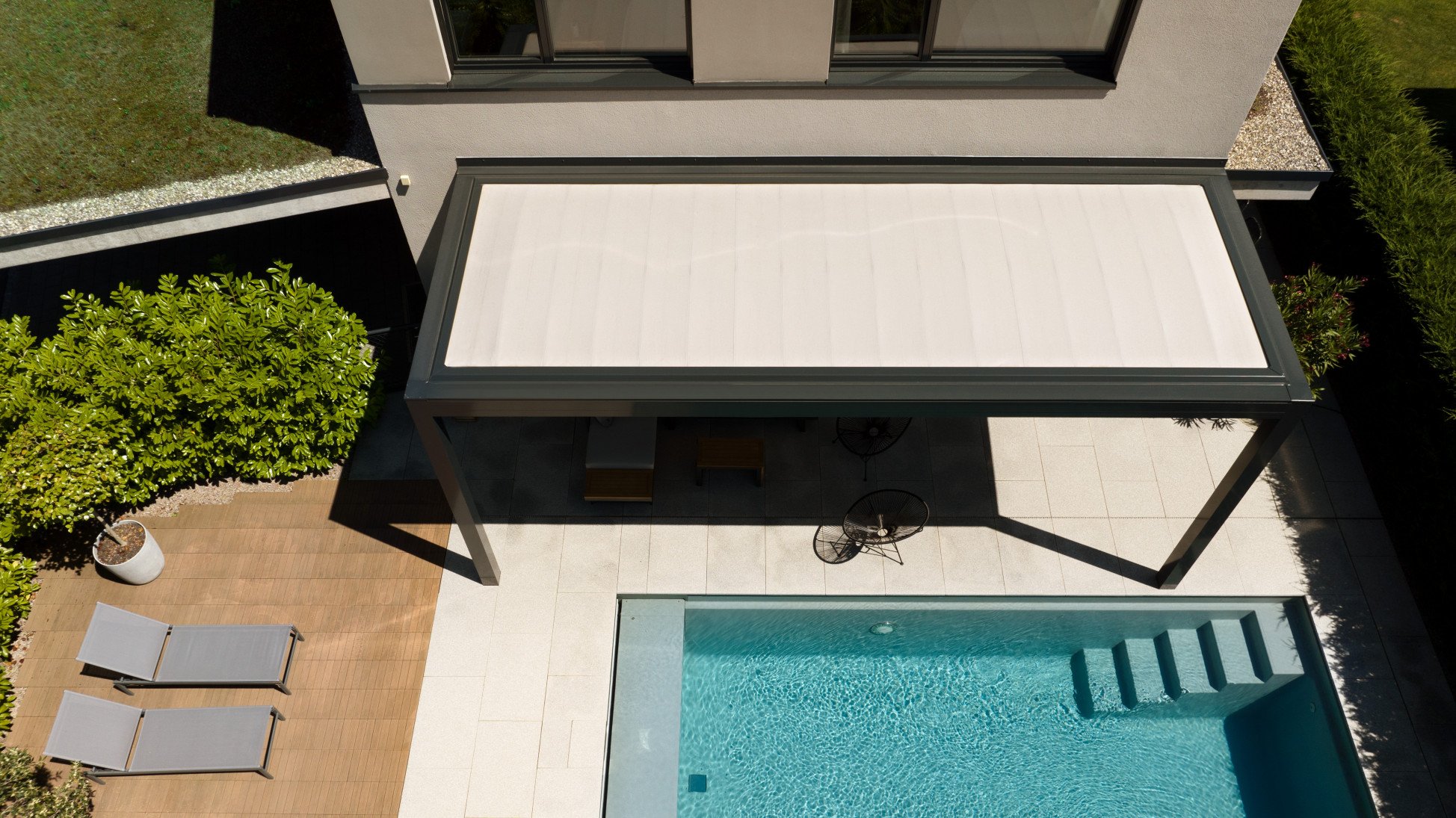 The owners have added an inviting lounge area on the sun-exposed south-west side of their modern single-family home. It looks directly over the water of the adjoining swimming pool. Because they enjoy spending time in the seating area, the family decided to install a sturdy, permanent roof solution that they could open and close depending on the weather, or even leave open for longer periods.