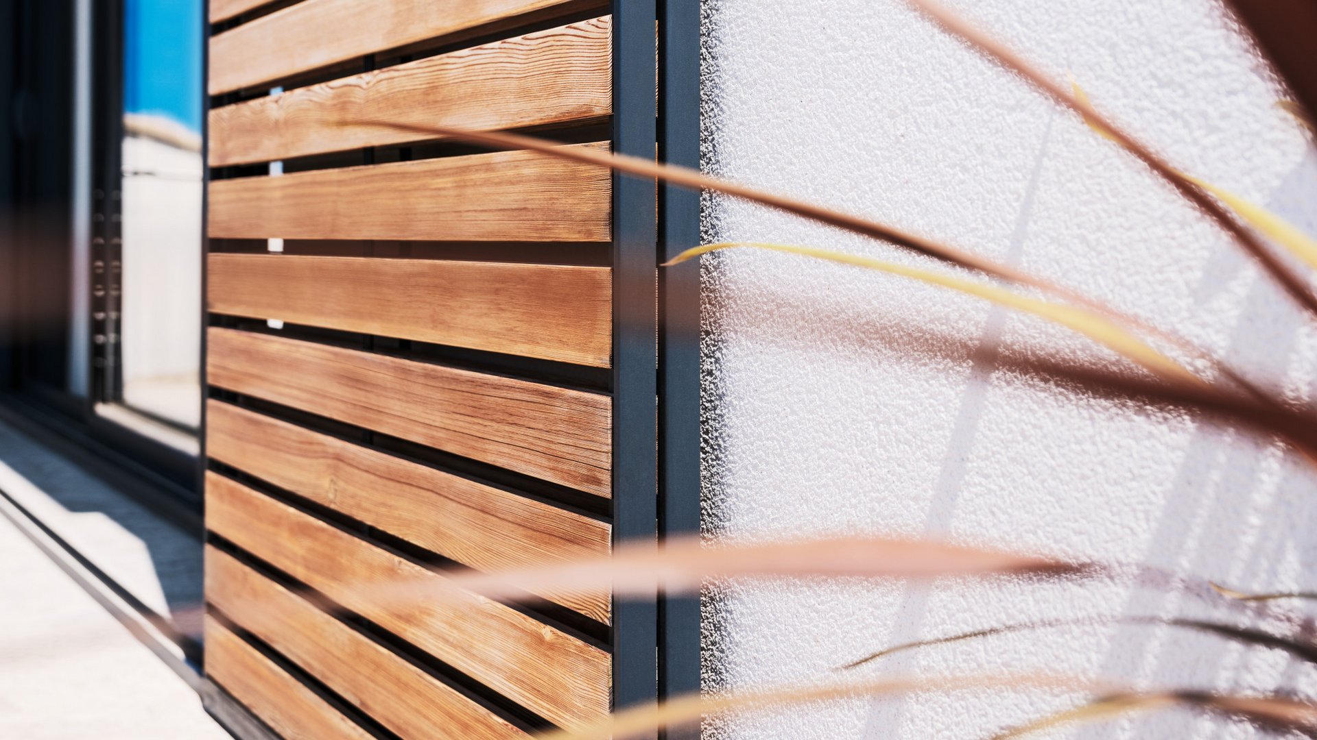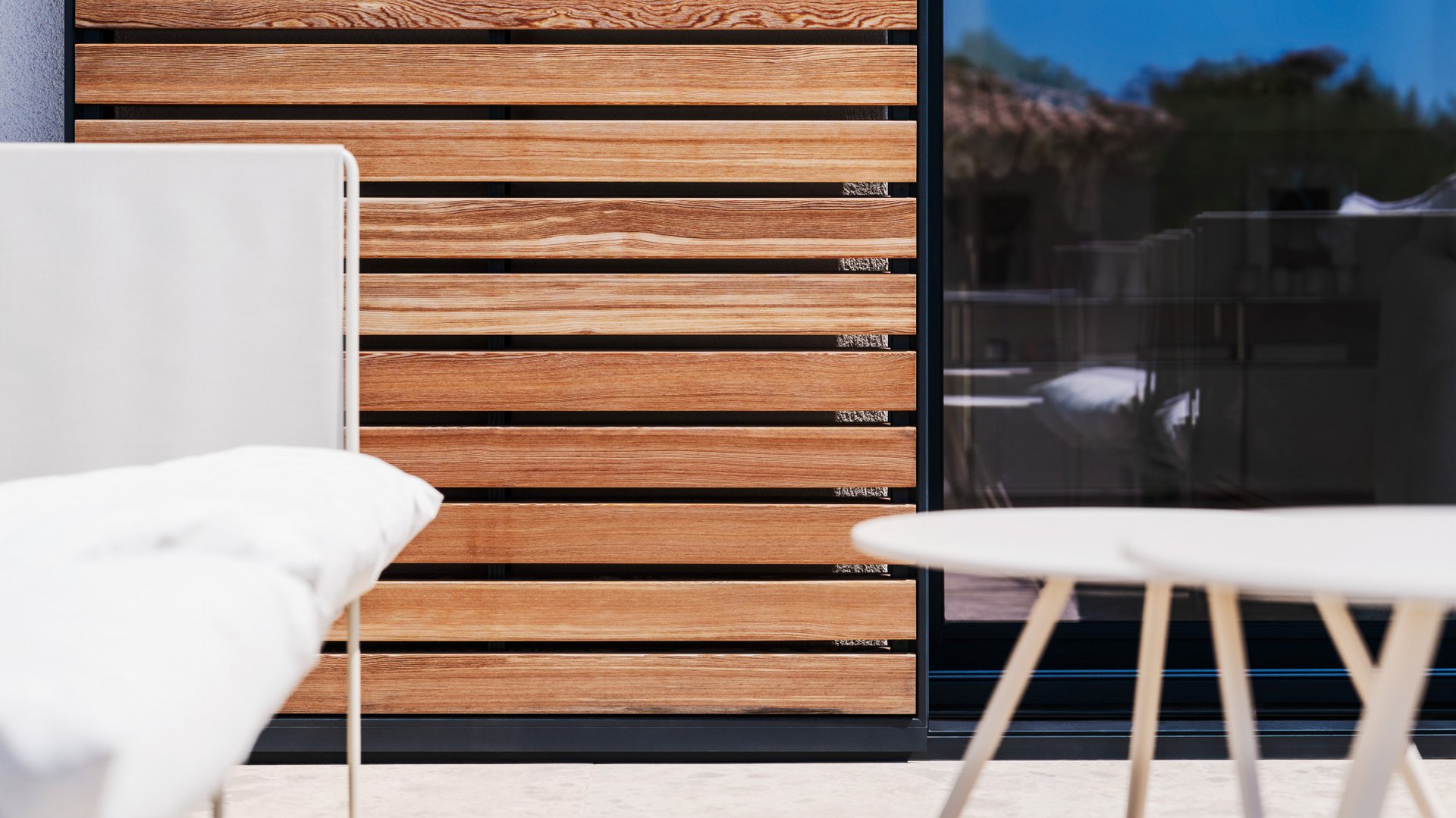 The sliding shutters further enhance the home’s contemporary look. Together with the visibly mounted guide rails, they blend harmoniously into the façade and stand out as a distinctive architectural feature. The larch used for the slats is impressive not only in appearance but also in its performance. It is extremely durable, maintains its shape and withstands the elements over time. The solid construction of the entire system does away with the need for additional safety devices such as wind detectors. It provides excellent stability even in strong winds and no rattling at all.