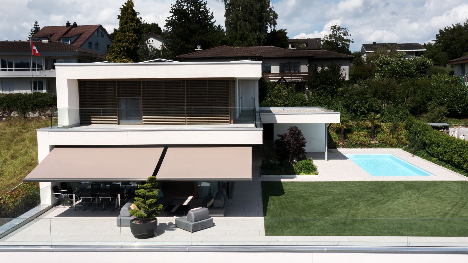 This new construction, characterised by its window fronts, blends harmoniously into the sloping hillside of its exclusive vineyard location. The distinct, elegant design and light, spacious rooms lend a certain charm to this single-family home. Flooded with natural light, they create a homely feeling and a unique ambience. The floor-to-ceiling windows create an airy light feel as well as a natural link between the indoor and outdoor living areas. The panoramic view of the Alps and Bünztal is wonderful.
