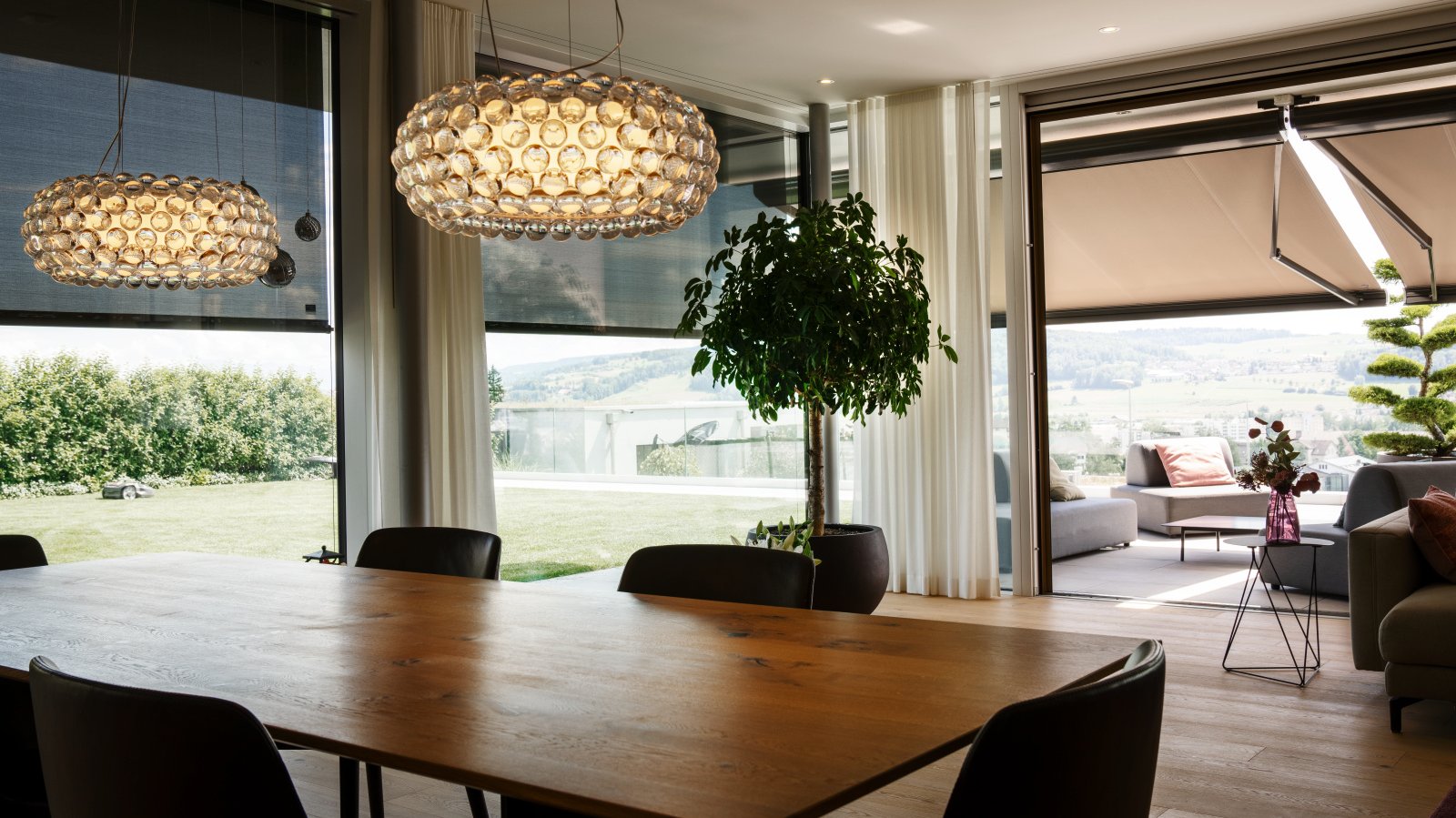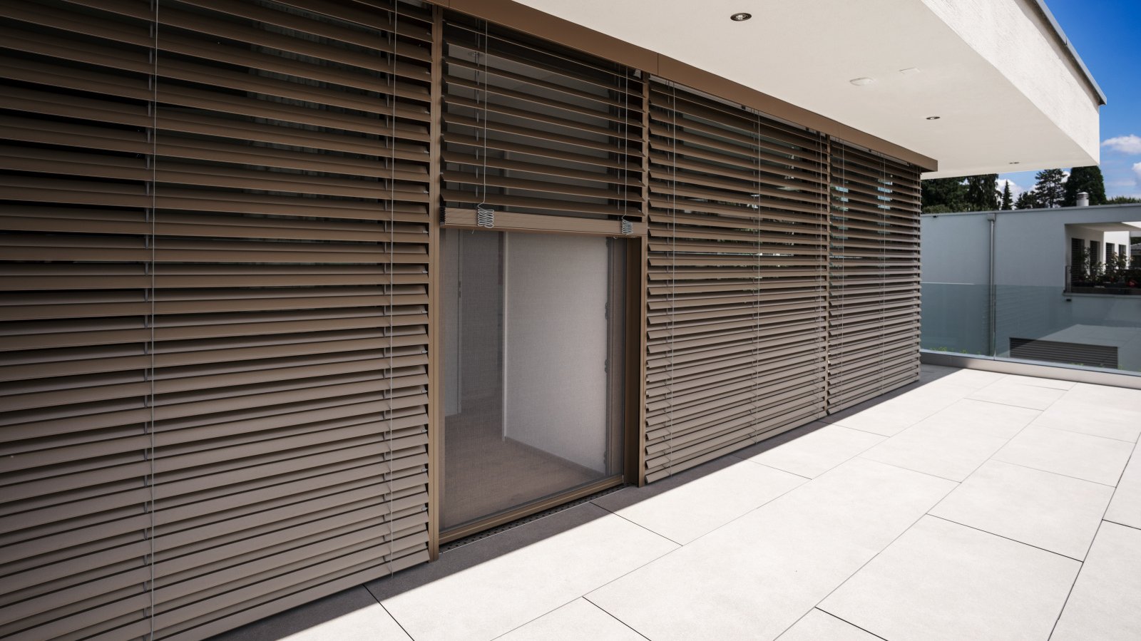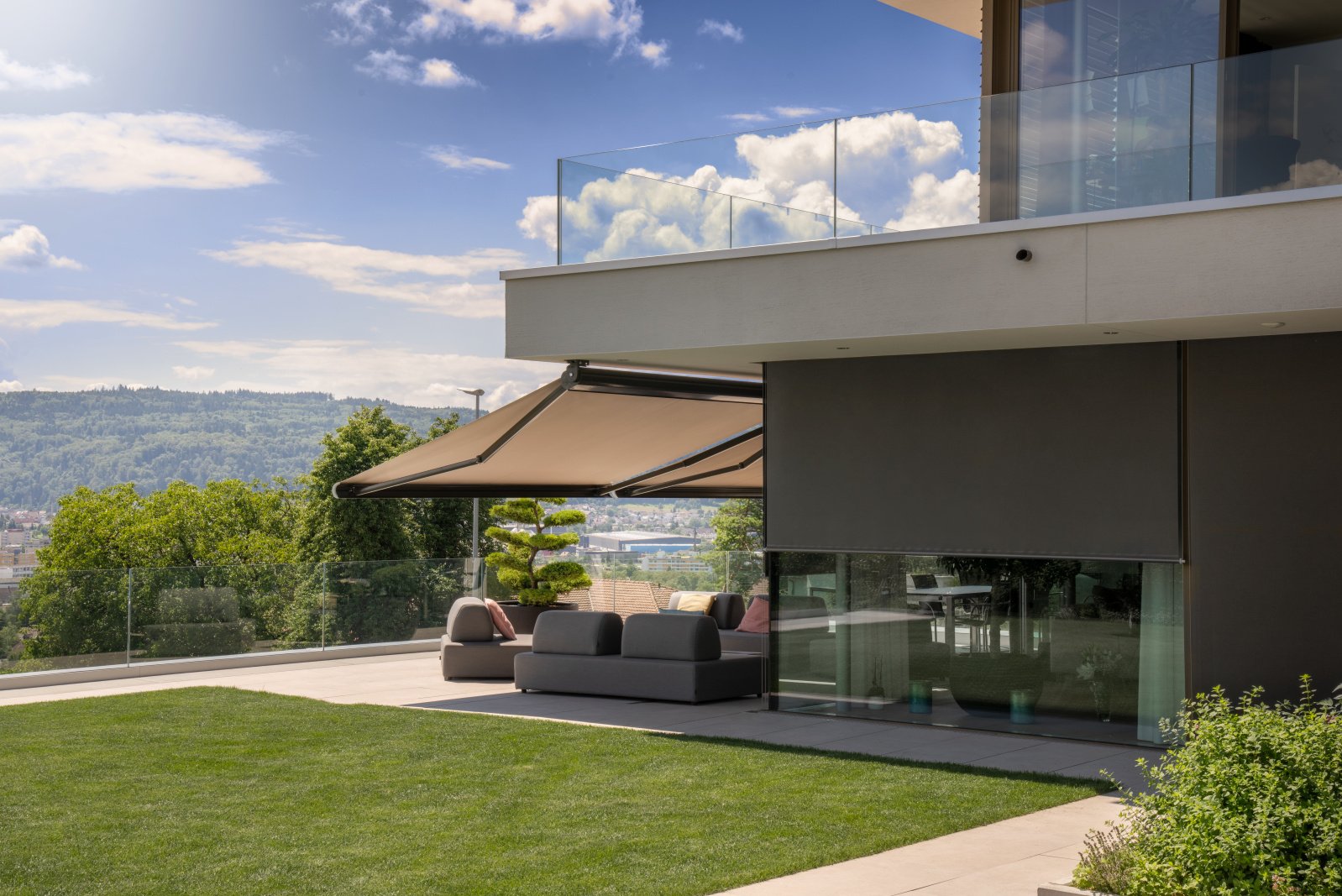The glazed interior spaces unite the sense of security with the feeling of expansive space outside. Having an intelligent sun and weather protection is key to ensuring all this open space provides an all-round pleasant living experience, We were involved in the project right from the start, during the planning phase, this way we were able to meet the highest demands working in close cooperation with the architects and client. The terrace with its magnificent view is fitted with beige cassette awning KGM 6 so you can enjoy outdoor life to the fullest even on hot summer days. So as not to disturb the aesthetically perfect look, the attachments for the wire cord guides of the vertical fabric blinds VS 150 on the ground floor were installed under the floor panels. Its see-through mesh does not block out the wonderful views even when it is closed. The compact venetian blind VR 90 with built-in compact insect screen mounted in the recesses on the upper floor ensures pleasant lighting conditions and undisturbed nights. The ultra slim gallery panel is an elegant detail that beautifies the construction with an air of delicacy.
