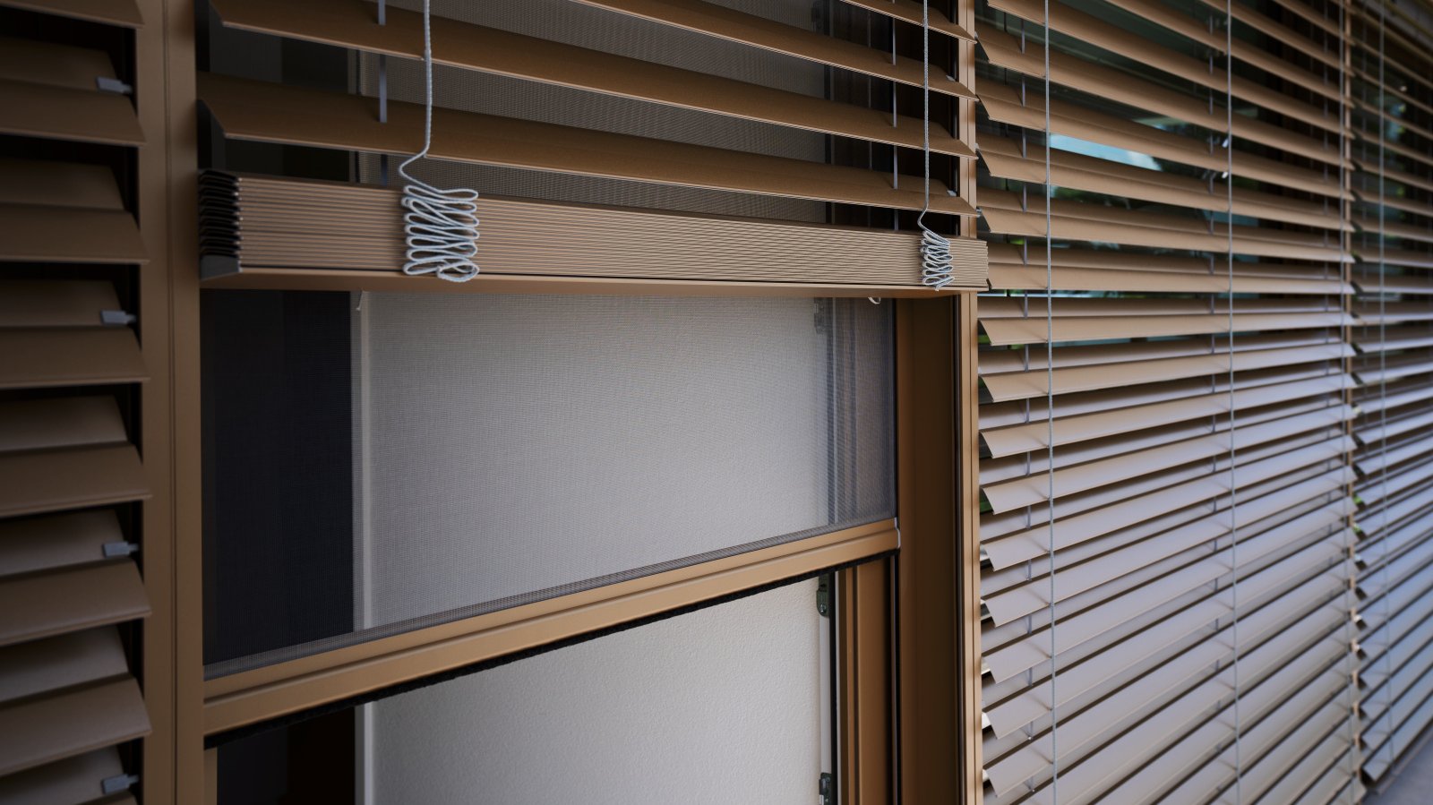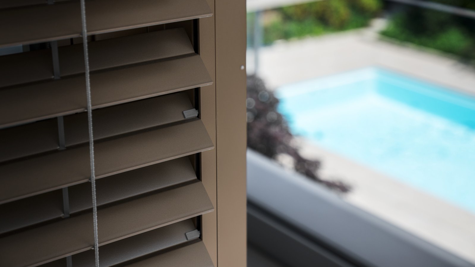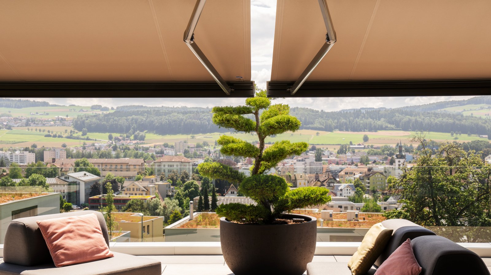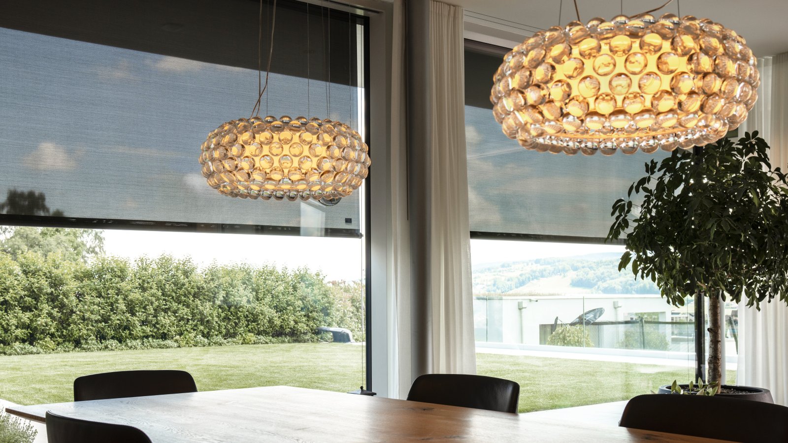 The glazed interior spaces unite the sense of security with the feeling of expansive space outside. Having an intelligent sun and weather protection is key to ensuring all this open space provides an all-round pleasant living experience, We were involved in the project right from the start, during the planning phase, this way we were able to meet the highest demands working in close cooperation with the architects and client. The terrace with its magnificent view is fitted with beige cassette awning KGM 6 so you can enjoy outdoor life to the fullest even on hot summer days. So as not to disturb the aesthetically perfect look, the attachments for the wire cord guides of the vertical fabric blinds VS 150 on the ground floor were installed under the floor panels. Its see-through mesh does not block out the wonderful views even when it is closed. The compact venetian blind VR 90 with built-in compact insect screen mounted in the recesses on the upper floor ensures pleasant lighting conditions and undisturbed nights. The ultra slim gallery panel is an elegant detail that beautifies the construction with an air of delicacy.