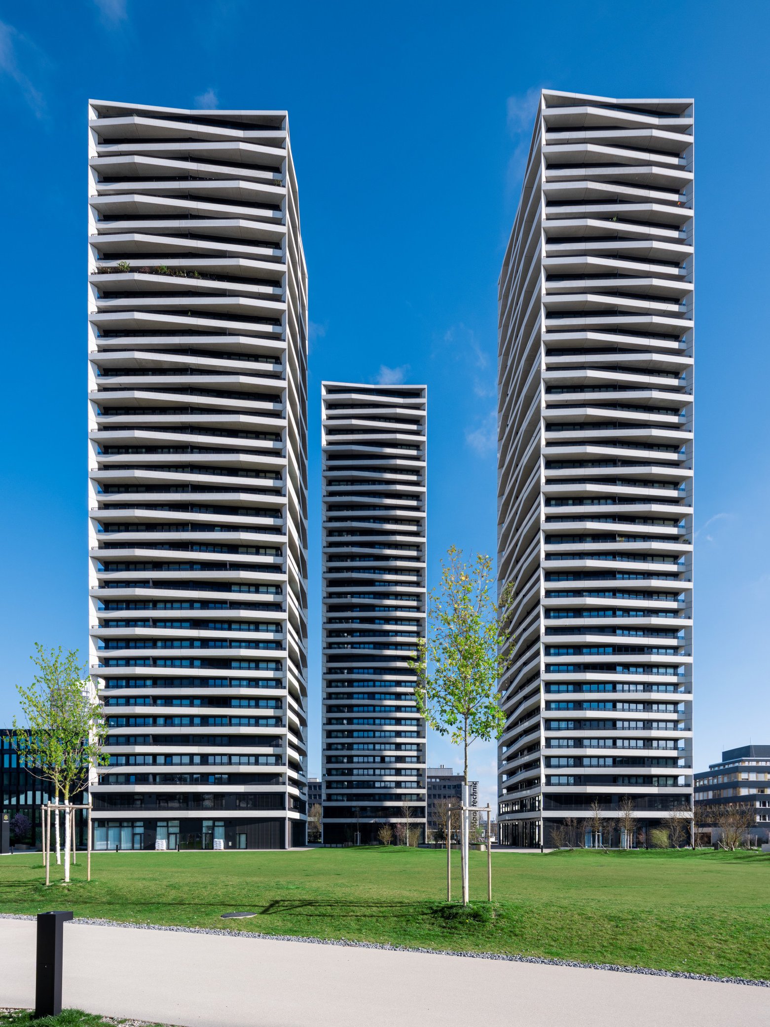 Right next to Stettbach station in Dübendorf, Switzerland’s tallest residential buildings reach for the sky: the Three Point Towers. Soaring up to 113 metres with as many as 38 floors, these three offset towers house over 400 apartments, a variety of commercial spaces, a school, a sports hall, and even a park complete with a pavilion and restaurant. This major development was brought to life in phases, with all three towers going up at the same time—a real test of planning and coordination.