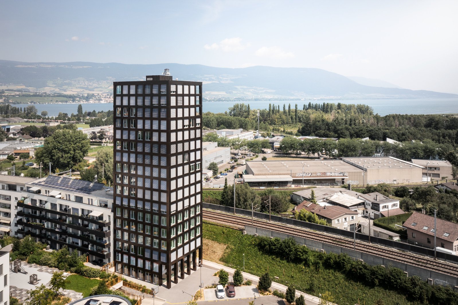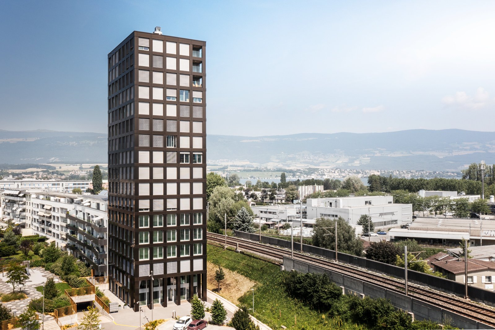 Once upon a time, the 52-meter high LANDI grain silo on Avenue Haldimand, built in 1970, was the tallest structure in Yverdon-les-Bains. But those days are gone – it was decommissioned in 2013. Now the similarly sized, Tour Invictus, a 54-meter high-rise block of flats, hovers over the city in its place. It offers breathtaking views over Lake Neuchâtel, the Jura and the Alps. The sunlight is reflected off the Alcubond coating on the facade’s composite panels into the 29 apartments with loggias as well as into the administrative areas. This natural light reflection varies depending on the season and underscores the modern look of the architecture. Because of the large proportion of glazing, the building requires an intelligent sun protection system that it is coordinated with the use of daylight. All the more so since good lighting conditions create a comfortable living climate and improve our well-being – not to mention significantly increasing the building’s energy efficiency. Every detail has been explored in depth during the planning stages, from the choice of materials and fire protection solutions to the technical controls.