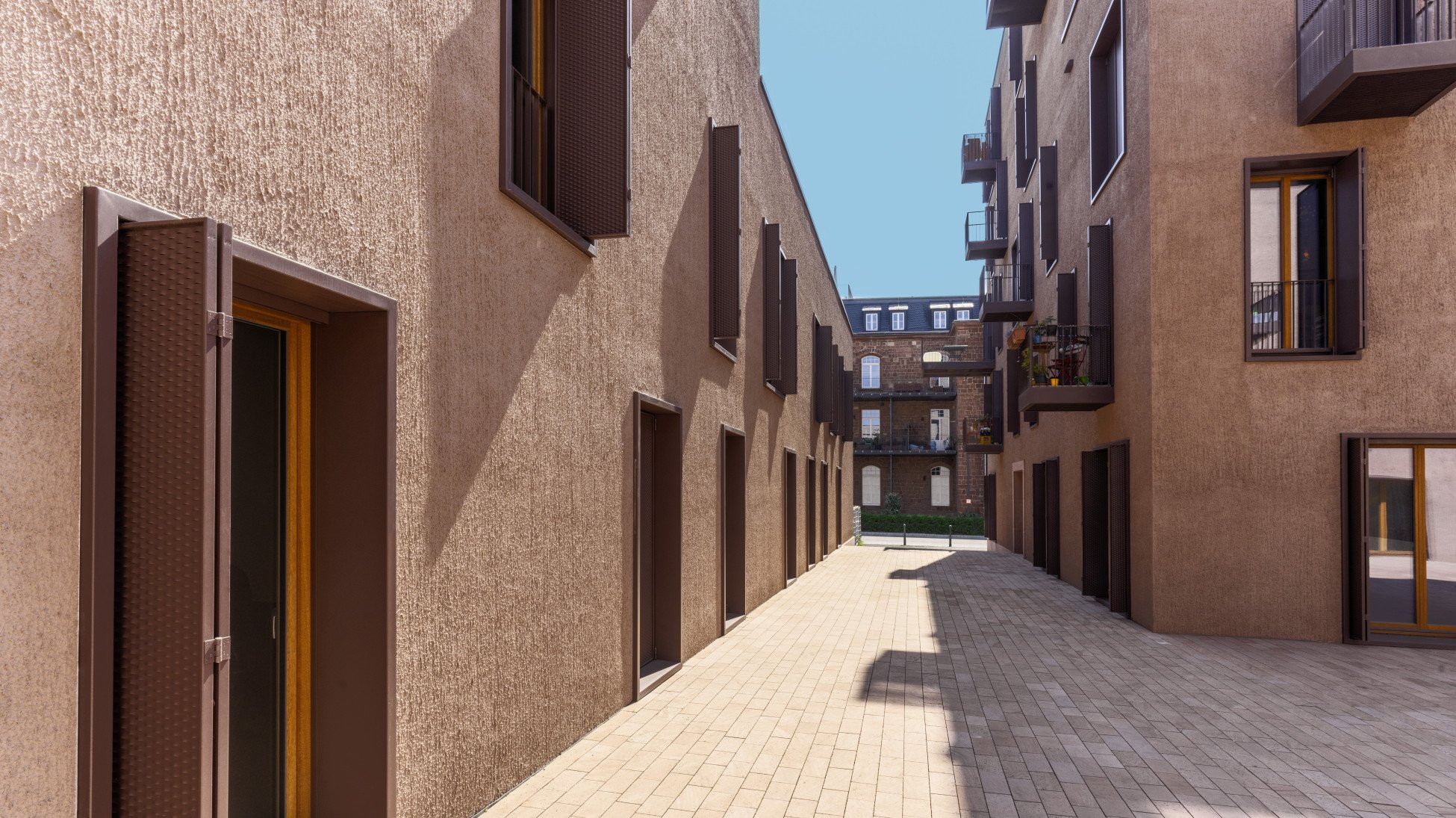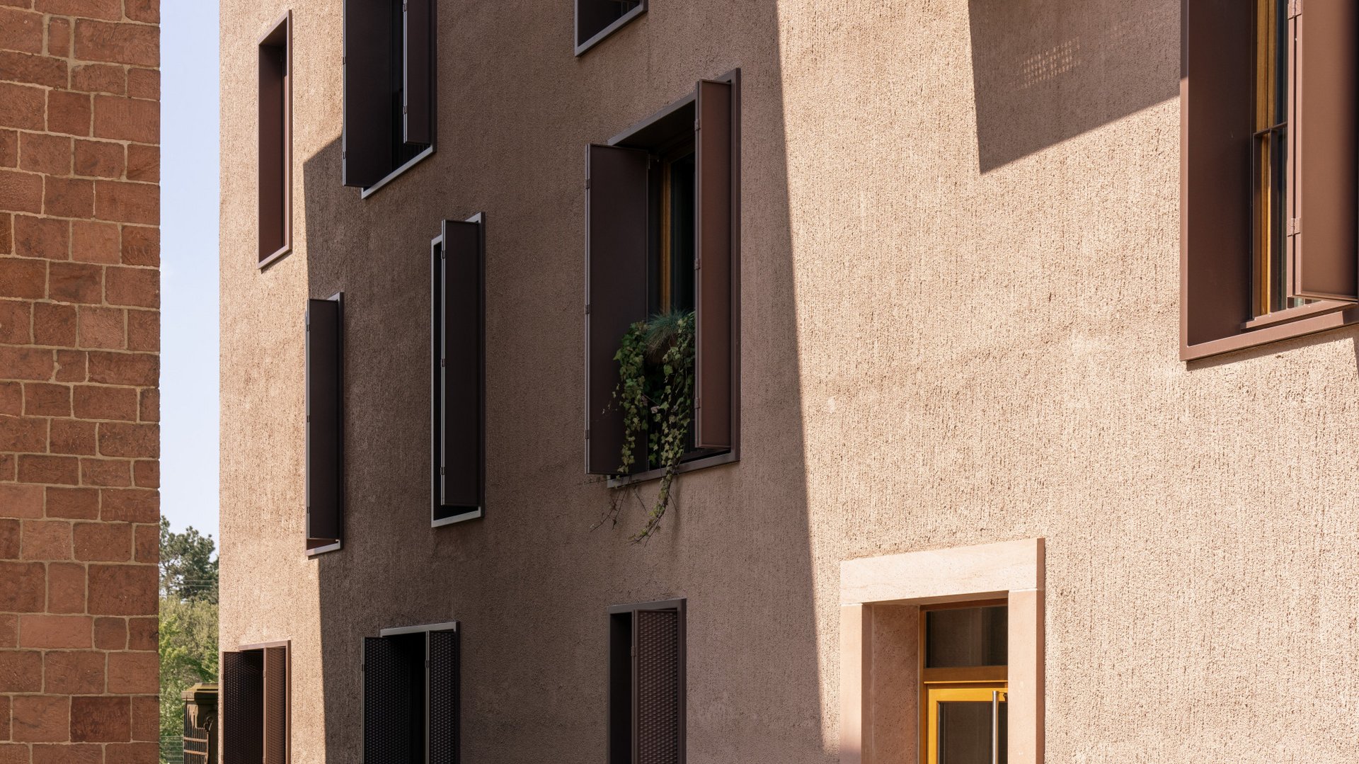 The quarter consisting of two apartment buildings, a daycare centre and another building, is part of a project to transform the former Turley Barracks in Mannheim whose magnificent listed army barracks buildings date back to the German imperial period. Interwoven with alleys, the imposing buildings are grouped around a central town square and give the newly created area the feel of an autonomous city. The result is a fascinating ensemble of old and new architecture. Using just a few basic materials such as plastered bricks, load-bearing reinforced concrete, wood and steel, really brings the monolithic architecture to the fore. And because there isn’t any insulating material, the construction is method is both future-oriented and traditional, in addition to working well in terms of energy.