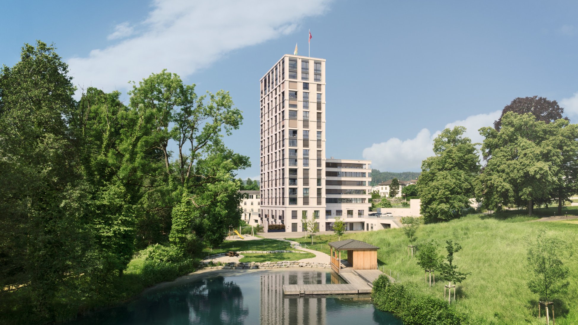 The site where a mill wheel turned since 1288 and was home to the Eberle Mills until two years ago, has become the new address of residential tenants as of August 1, 2021. They now occupy a high-rise consisting of 44 high-quality 2.5- to 4.5-bedroom apartments with floor-to-ceiling windows as well as loft apartments in the annexed machinery building. The 60,000m2 site is rounded off with a swimming pool and a roof terrace for the tenants.