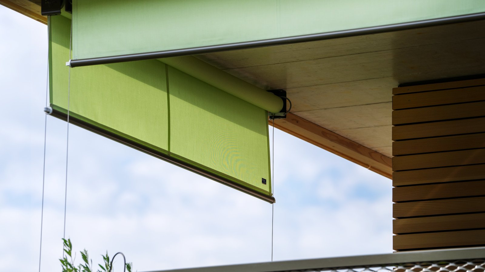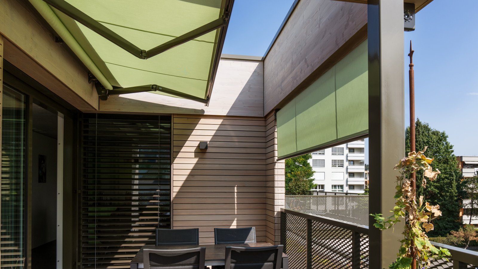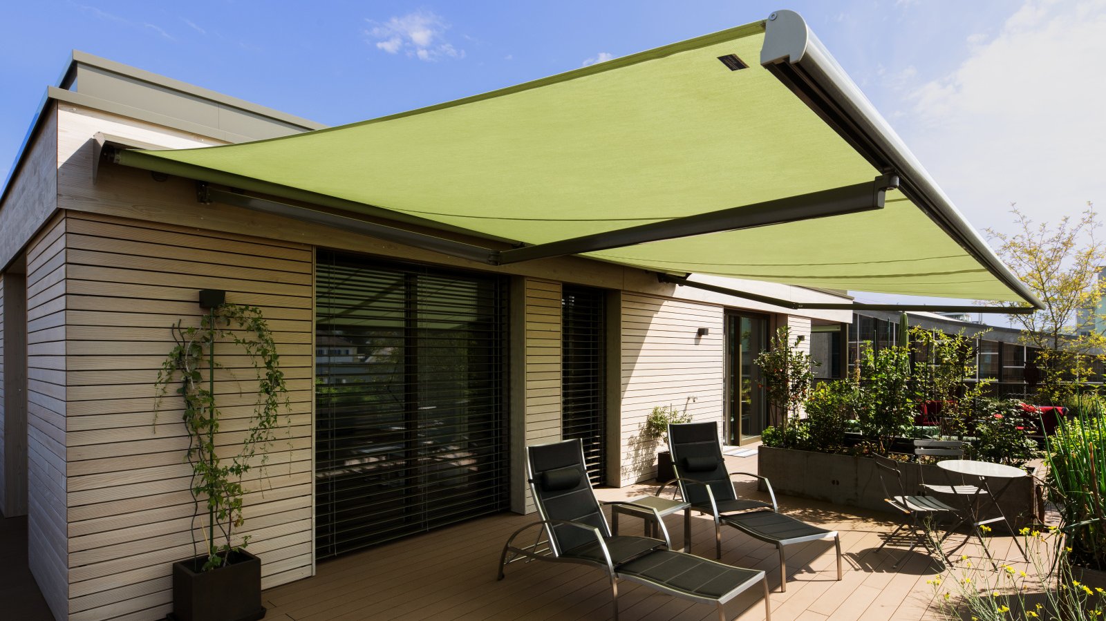 Floor-to-ceiling windows transform the rooms into a beautiful oasis of well-being. Filled with light, it is as though the living area were merging with nature. Three different sun protection systems support these pleasant lighting conditions both inside and out. To underscore this impression, conservative earthy colours inspired by the garden were selected for the other building materials. The amount of daylight let in can be individually controlled on each window as they are fitted with the adjustable compact venetian blind (VR 90). The VS 150 vertical fabric blind provides excellent sun protection for the seating areas while also creating head-turning aesthetics. Since it was not possible to mount a standard assembly here, special holders were made to measure for their rope attachments, which were screwed directly into the bottom chord of the railing. The architects had to work closely again with the facade and metal companies on the attic floor, as a specially built wooden frame was needed to install the timeless standard awning NGM 20.