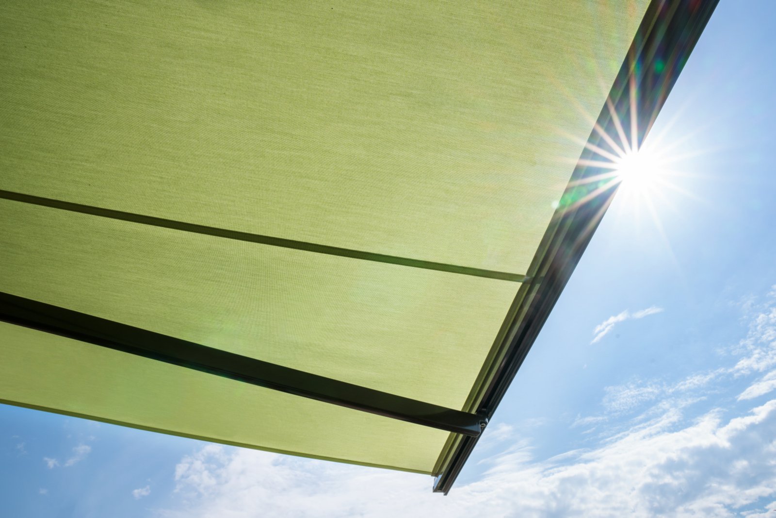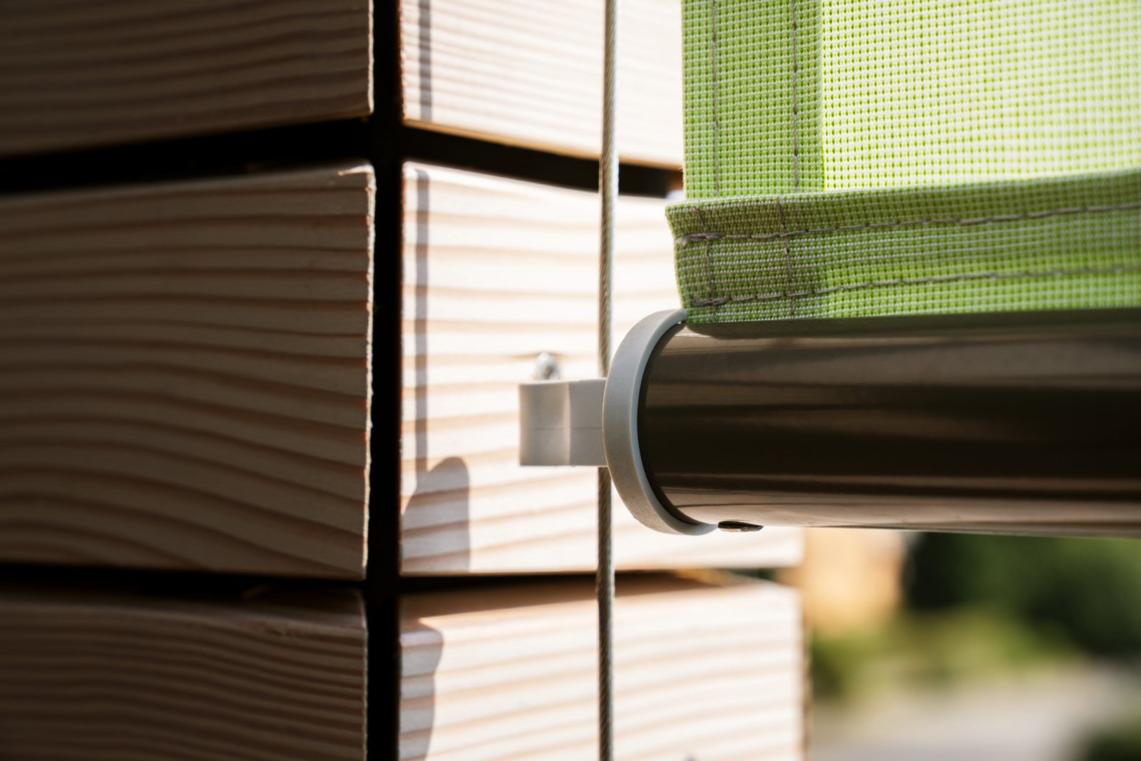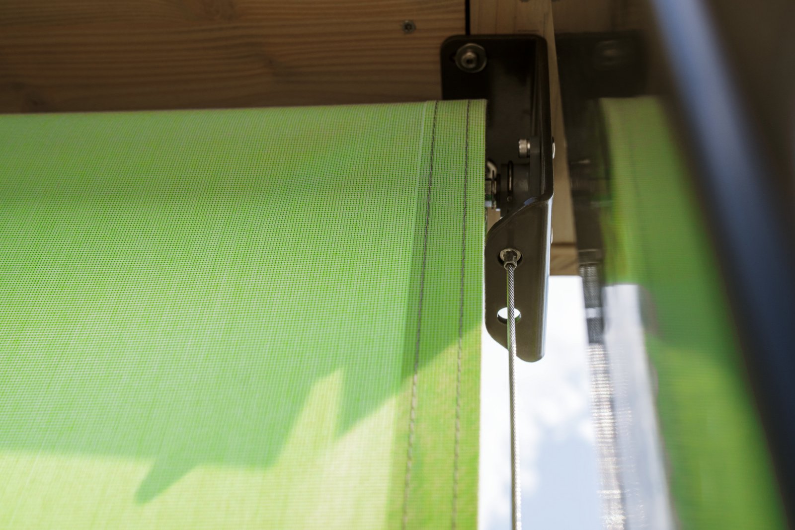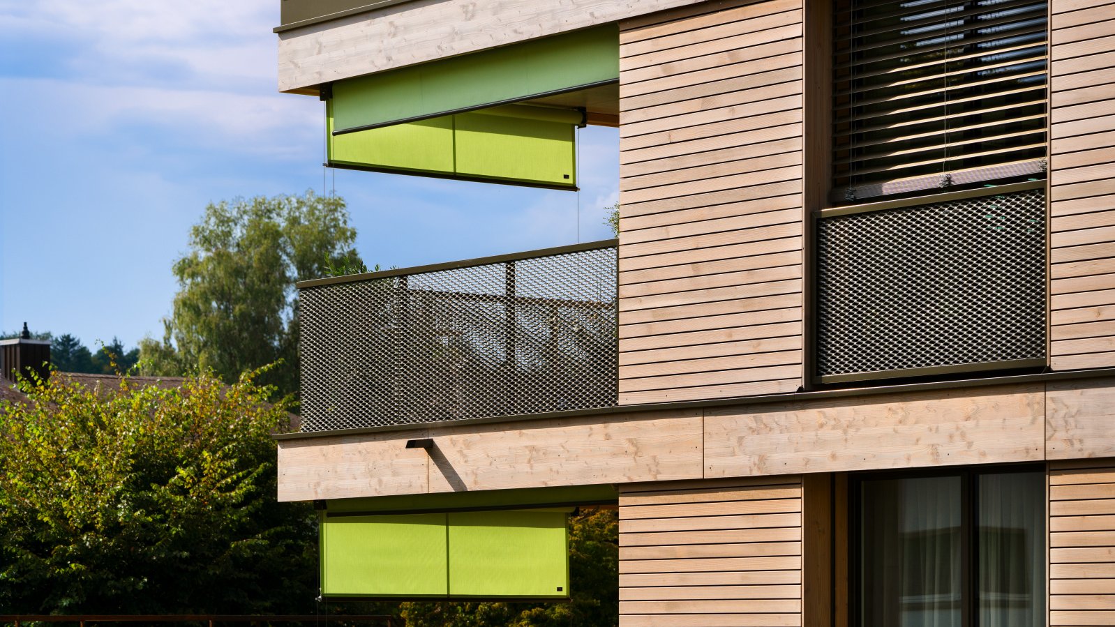 Floor-to-ceiling windows transform the rooms into a beautiful oasis of well-being. Filled with light, it is as though the living area were merging with nature. Three different sun protection systems support these pleasant lighting conditions both inside and out. To underscore this impression, conservative earthy colours inspired by the garden were selected for the other building materials. The amount of daylight let in can be individually controlled on each window as they are fitted with the adjustable compact venetian blind (VR 90). The VS 150 vertical fabric blind provides excellent sun protection for the seating areas while also creating head-turning aesthetics. Since it was not possible to mount a standard assembly here, special holders were made to measure for their rope attachments, which were screwed directly into the bottom chord of the railing. The architects had to work closely again with the facade and metal companies on the attic floor, as a specially built wooden frame was needed to install the timeless standard awning NGM 20.