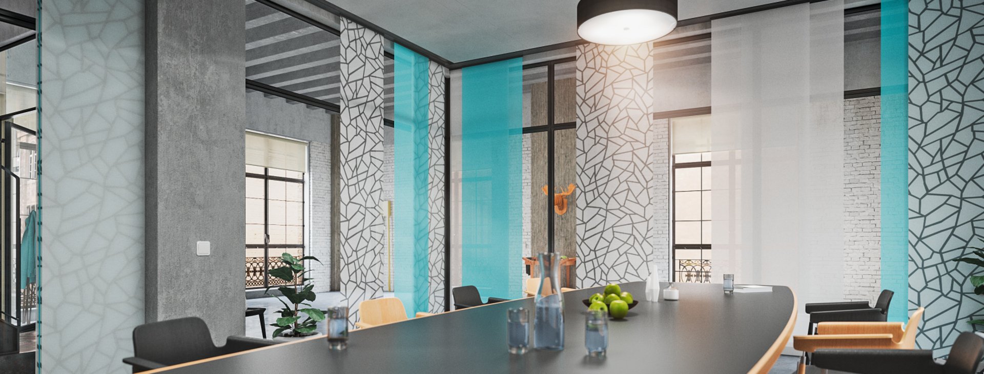 The panel curtain is our master of surprise effects and dividing up spaces. It wide fabric panels are decorative with an artistic touch and almost look like they are floating. Their minimalist design and the harmonious synergy between the fabric and technology are real head turners. Our panel curtains are particularly suitable as sight and glare protection in floor-to-ceiling windows or as decorative room dividers. With the different degrees of transparency, material textures, themes and colours, there is virtually no end to the creative possibilities of our panel curtains.