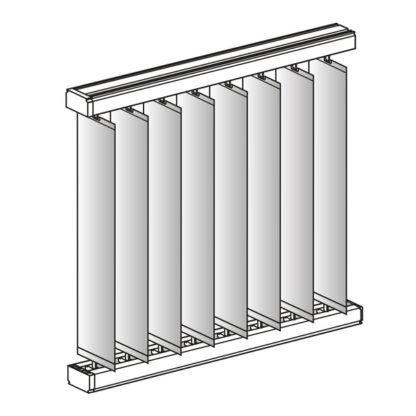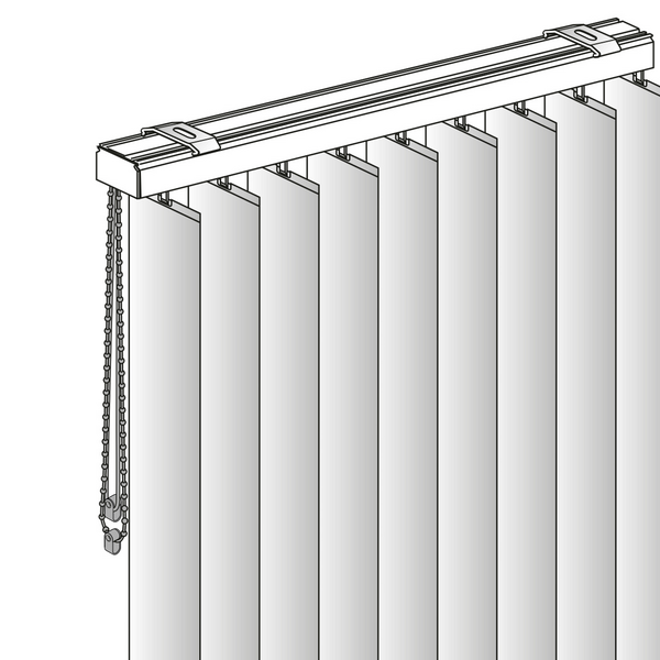 Our vertical blinds can be mounted on the wall or ceiling. Here the system is mounted in front of the window and covers the entire window recess. There is a selection of fixing elements to attach the upper rail to the wall or ceiling, such as fastening clips, wall supports and mounting profiles for a flush installation.