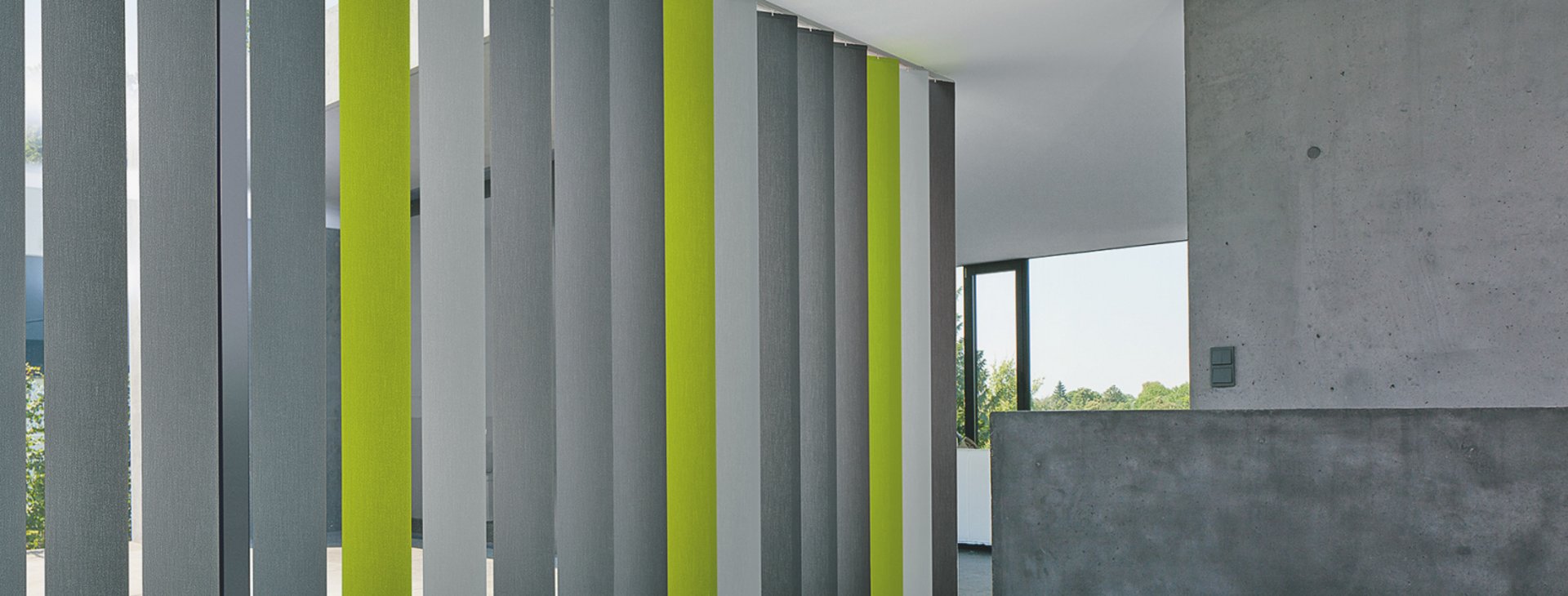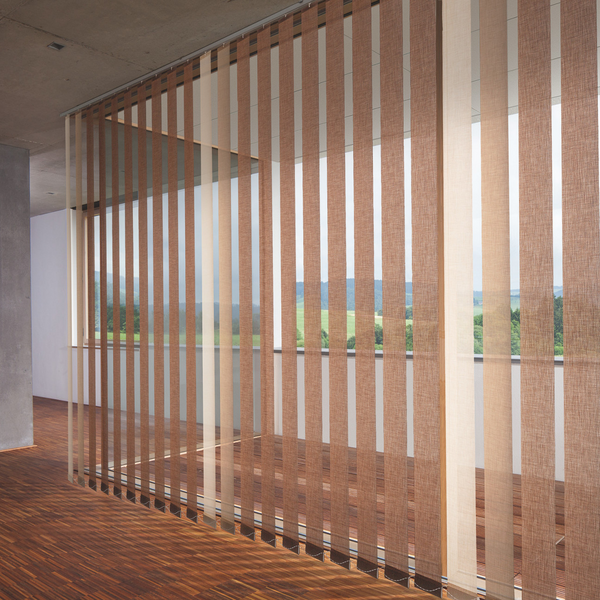 The vertical blind in the “room divider” design runs along an upper and lower rail and is fix tensioned. This means the drop can be individually turned and moved. The technology used throughout ensures the blinds move smoothly and securely, and is available colour anodised or powder-coated. The drop unit can be positioned and opened either left or right, in one or more pieces.