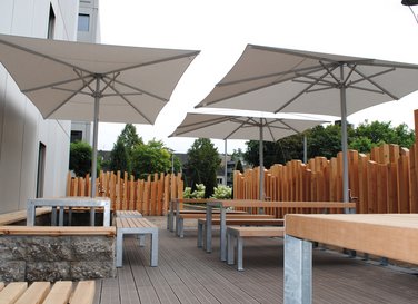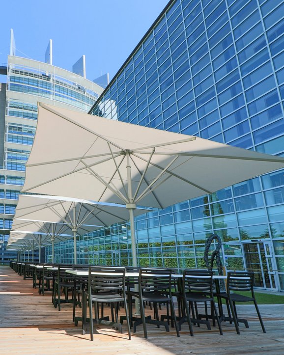 Schenker Storen offers sunshades that are specially designed for use in open-air dining, for example in street cafés and garden restaurants. Their clean design and impressive size lends a touch of exclusivity and conviviality to every terrace.