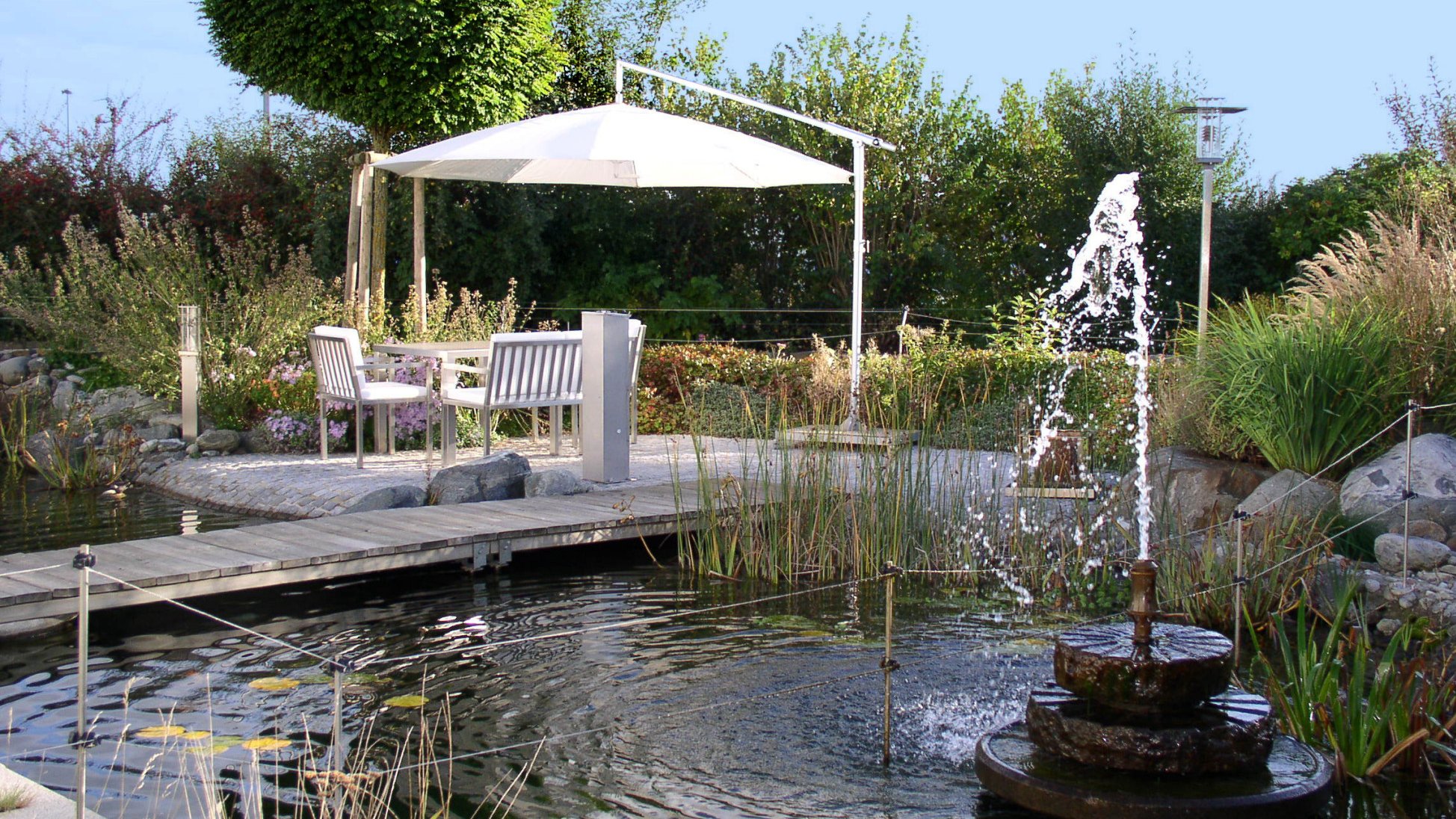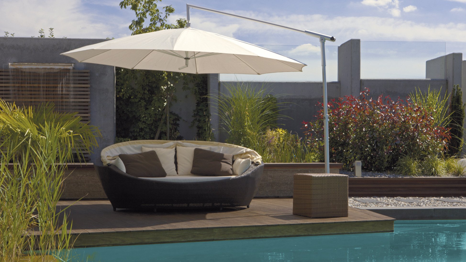 The cantilever hanging parasol Dacapo combines maximum flexibility with outstanding comfort. Its offset pole leaves the space beneath the canopy completely open, while the shade can be positioned effortlessly using the ball joint, height adjustment and swivelling cantilever arm. A canopy that adapts perfectly to any situation – elegant, sturdy and intuitive to use.