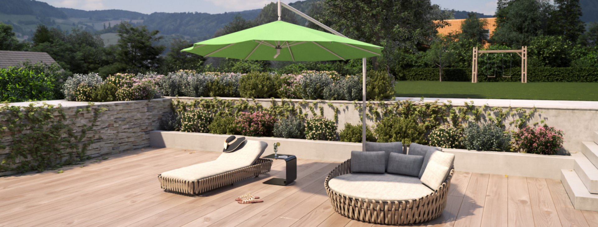 There is an interesting choice of options on offer for the cantilever hanging parasol, so it can best satisfy individual wishes and requirements. Countless fabric patterns and features accentuate the charming stylish design of terraces, balconies and garden seating areas.
