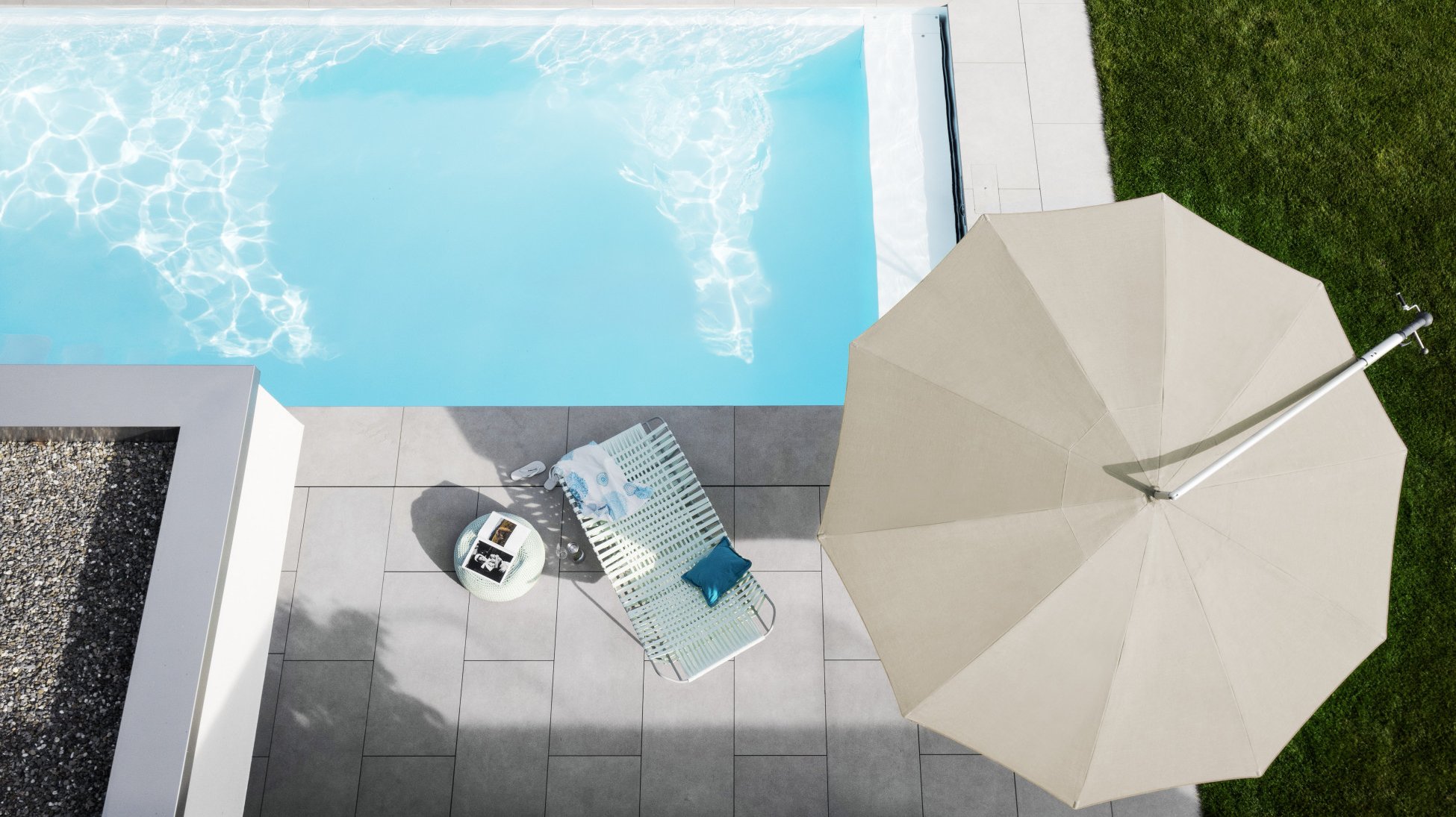 The cantilever hanging parasol Mezzo offers maximum freedom in outdoor spaces. Thanks to its offset pole, the area beneath the canopy remains completely free, allowing the shade to adapt flexibly to your furniture layout and use. Rotatable, tiltable and even vertically adjustable, the Mezzo provides not only optimal overhead sun protection but – when needed – also lateral privacy and glare protection. Precise, versatile and practical for everyday use.