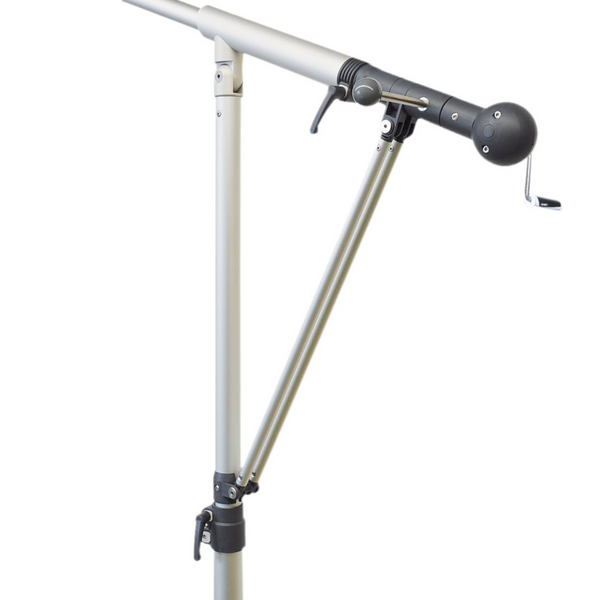 The DACAPO (DK) cantilever hanging parasol already has a built-in height adjustment in its basic model (DG), and in this variant, you can also use the crank handle to adjust the horizontal setting of the cantilever arm.