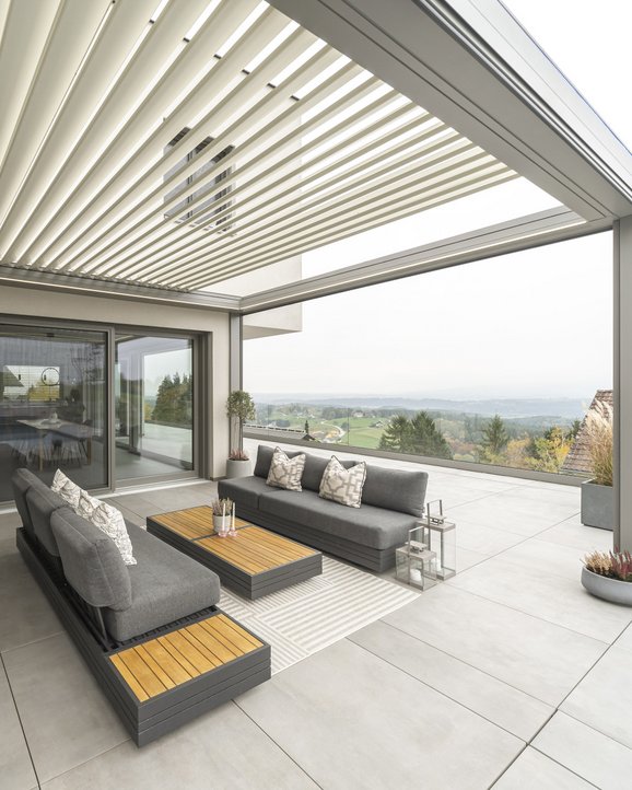 Terrace roofs and pergolas from Schenker Storen create genuine outdoor living experiences. If you want to extend your living space outdoors, this is the way to go. These all-weather protection solutions provide shade on sunny days, drain away the rain on wet days and ensure the air change for a pleasant climate. Thanks to this product, summer just got longer. Because of their flexible dimensions, the width and projection of the terrace canopies can be adjusted to suit your requirements – plus, their impressive design is a real head turner.