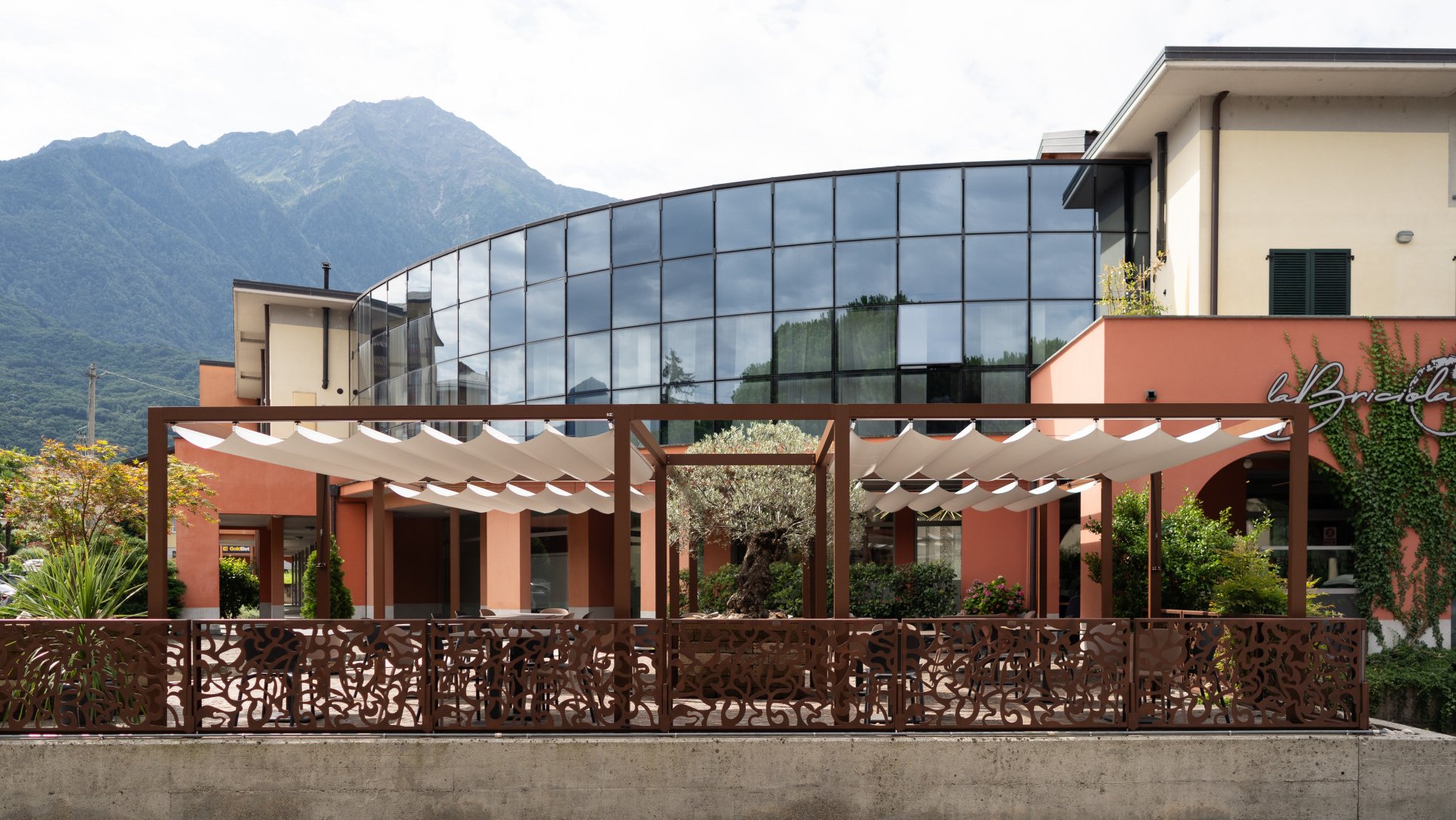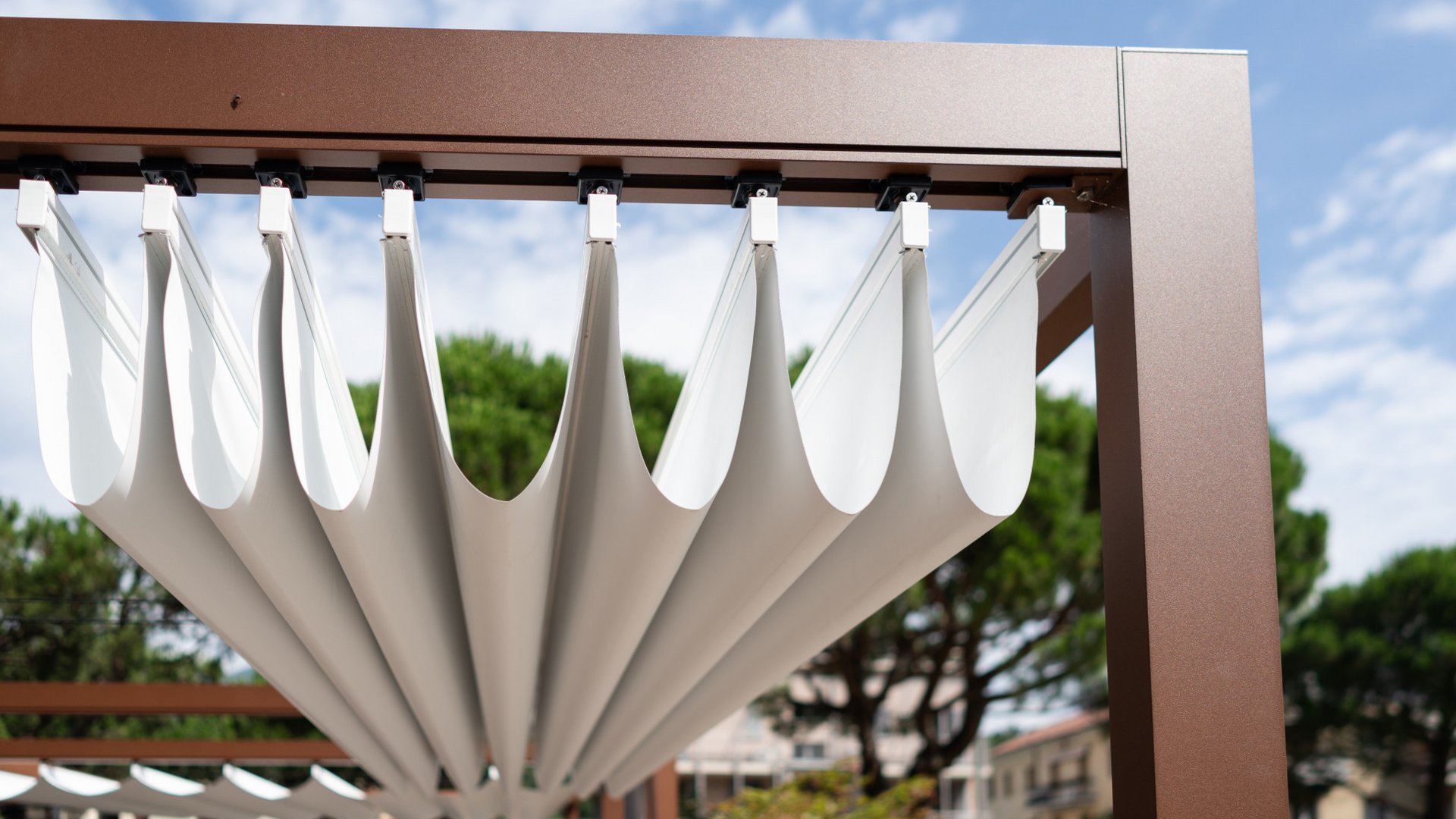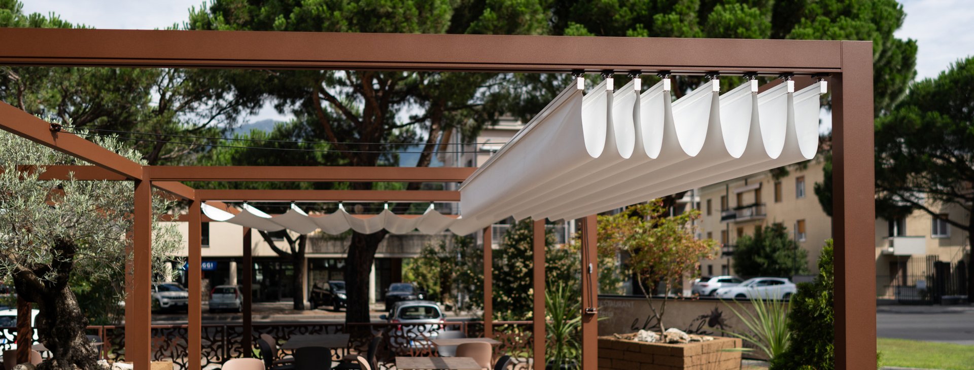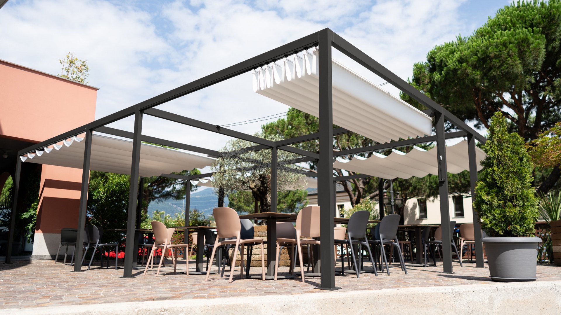The textile retractable roof provides pleasant shade and creates an inviting atmosphere exactly where flexible and uncomplicated shading is required.