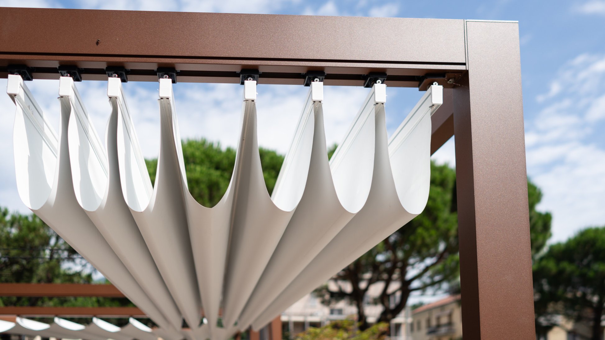 There is a whole range of options on offer for our folding pergola, so it can best satisfy your needs and desires. Countless fabric designs and a wide selection of colours for the frames help you create a beautiful look for your terraces, balconies and garden seating areas.