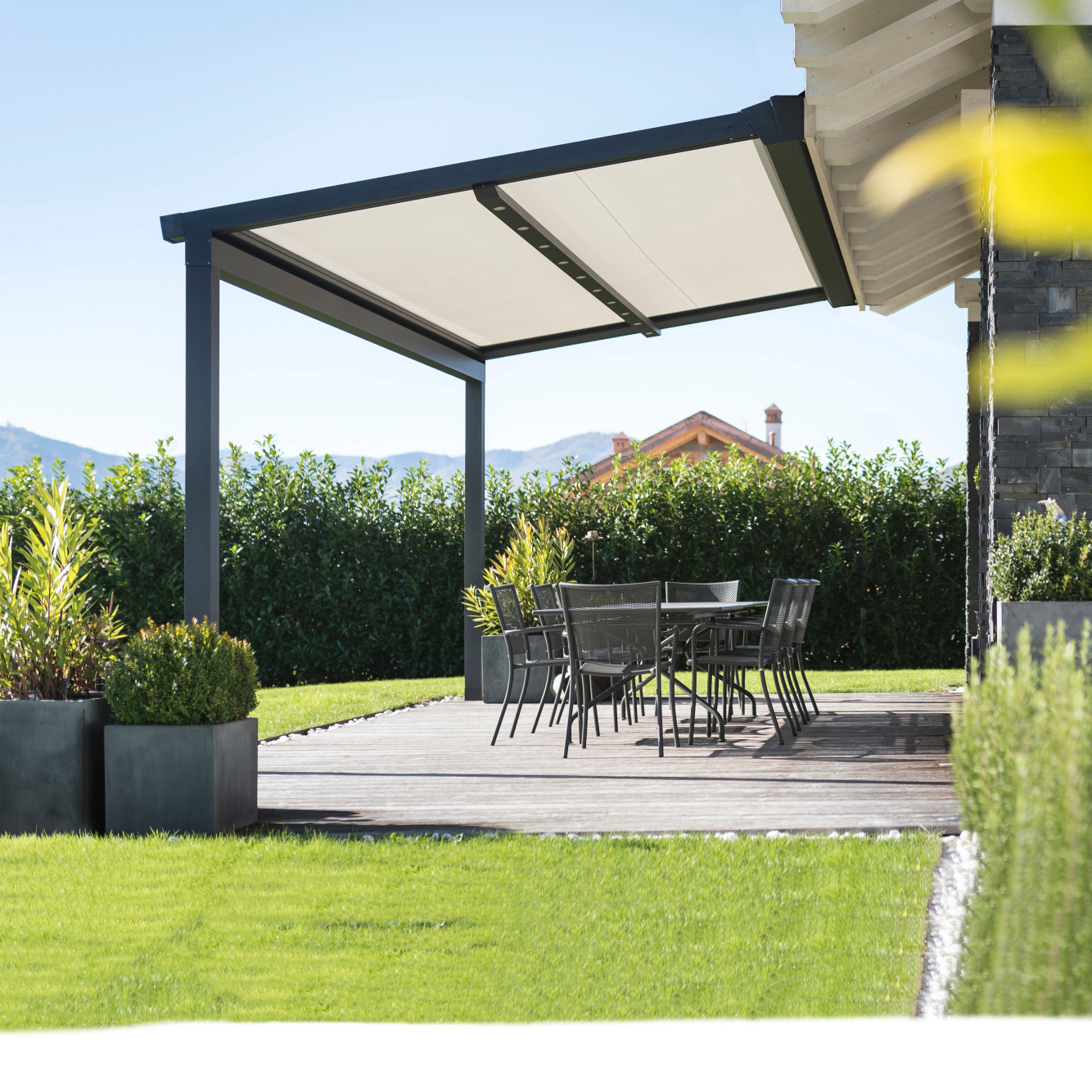 There is a whole range of options on offer for our pergola awning, so it can best satisfy your needs and desires. Countless fabric designs and a wide selection of colours for the frames help you create a beautiful look for your terraces, balconies and garden seating areas. For even more comfort, our products can be controlled using our clever Smart Home solutions. Our wide selection of sensors for the sun, wind and rain guarantee a safe operation in perfect synch with your product.