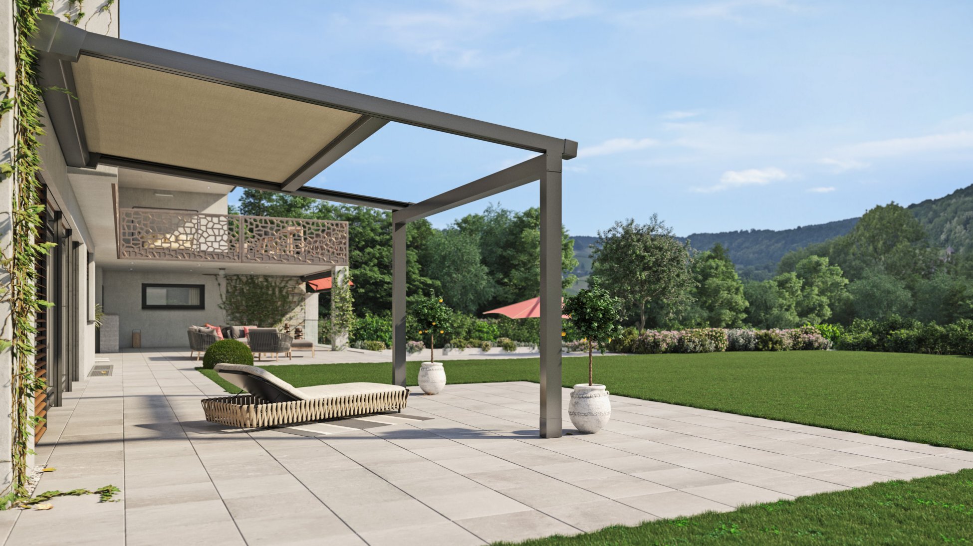 Our pergola awning builds on the advantages of a sun blind, offering extremely reliable protection from the wind and rain. Its dainty, breezy design and exclusive water-resistant collection of fabrics fit in beautifully with facades and terraces of all sizes, creating an inviting, harmonious overall look. Our pergola awning ZP 7 can be fitted with LED lighting and numerous other comfort features to create a relaxation oasis for every day, and almost any time of year.