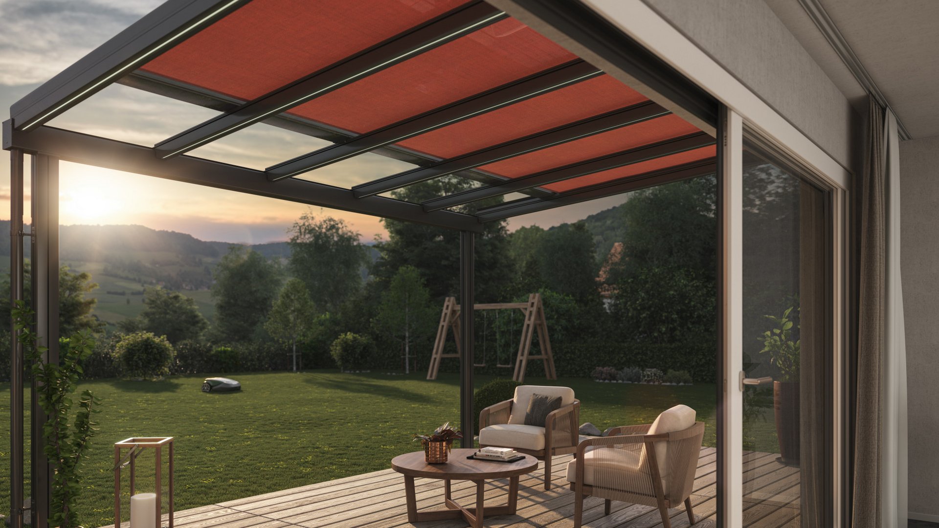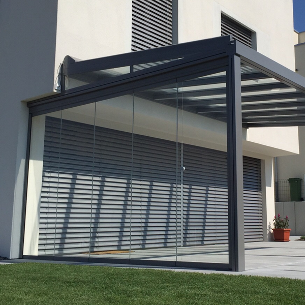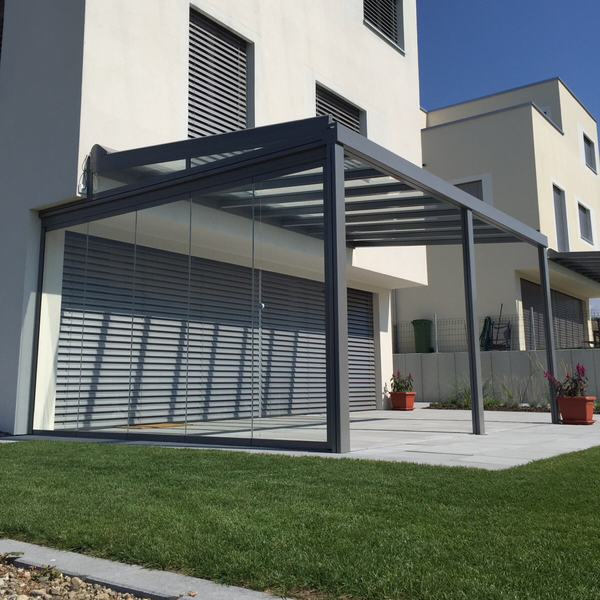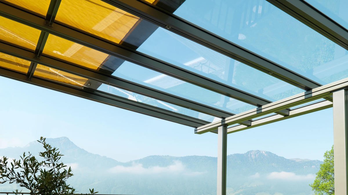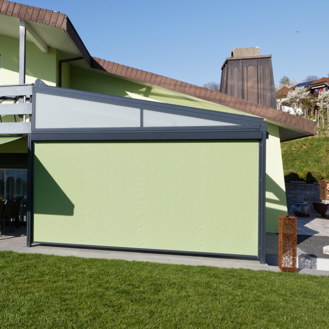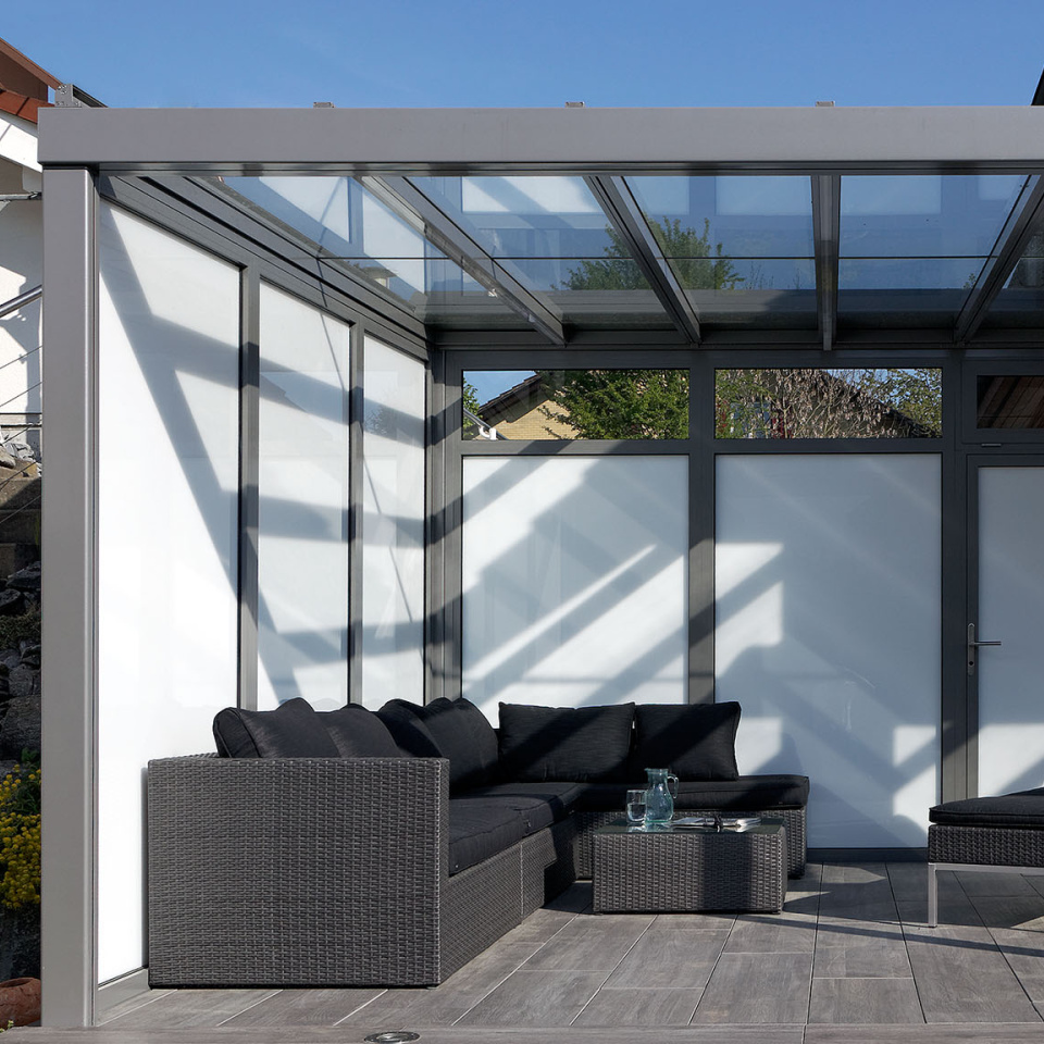 Our terrace roof is a paradigm of glass roofs. The transparent glass roof is attached to the house wall providing an unobstructed view upward, without blocking the natural light coming into your living space. It is an ideal form of permanent all-weather protection, under which furniture and BBQs can be stored all year round. On hot summer days, the canopy awning creates wonderfully cool and shaded areas. The delicate yet sturdy terrace roof fits in beautifully with the most diverse styles of architecture. It is also ideally suited for small to medium-sized garden seating areas and roof terraces. The dimmable LED lighting and vertical fabric blinds down the sides create the perfect lounge feeling.