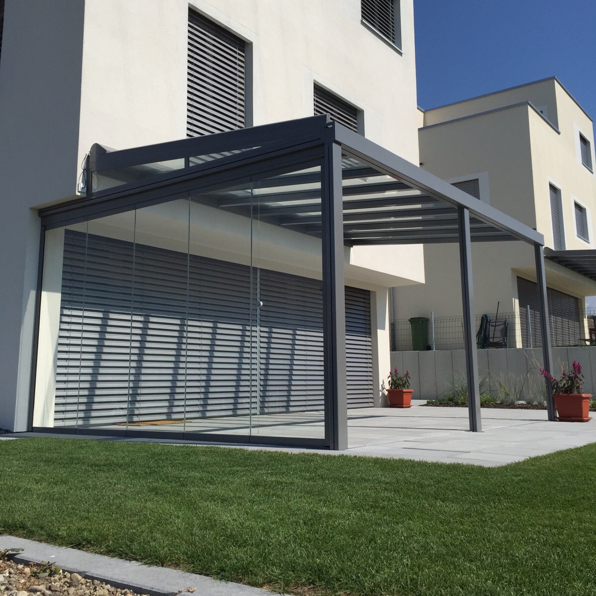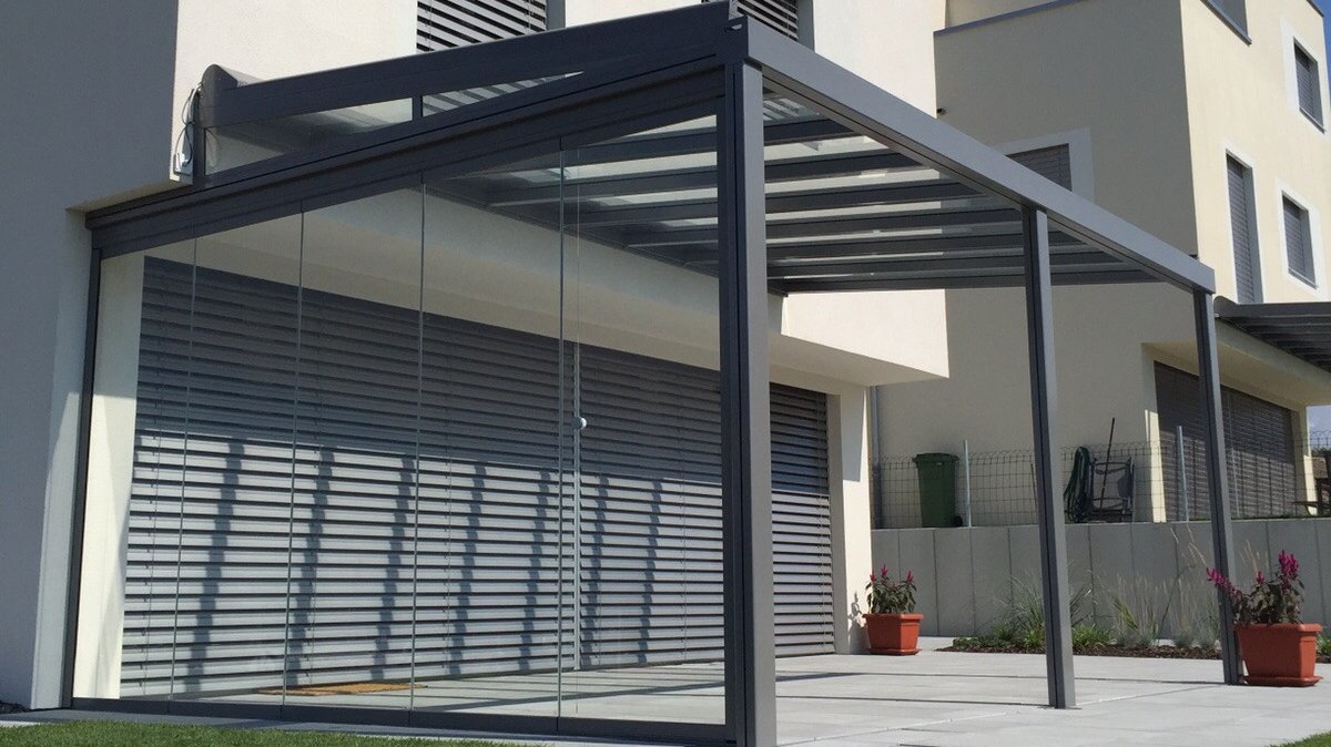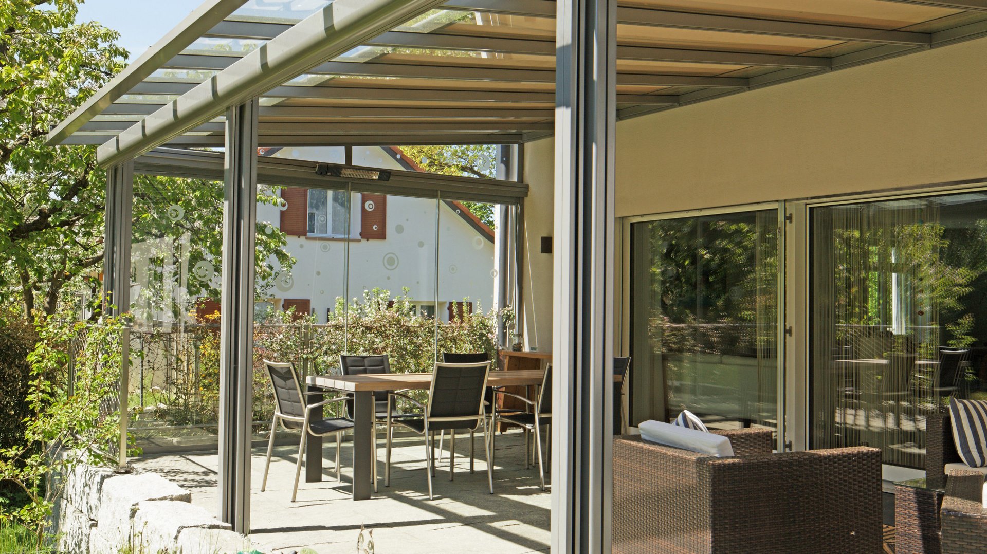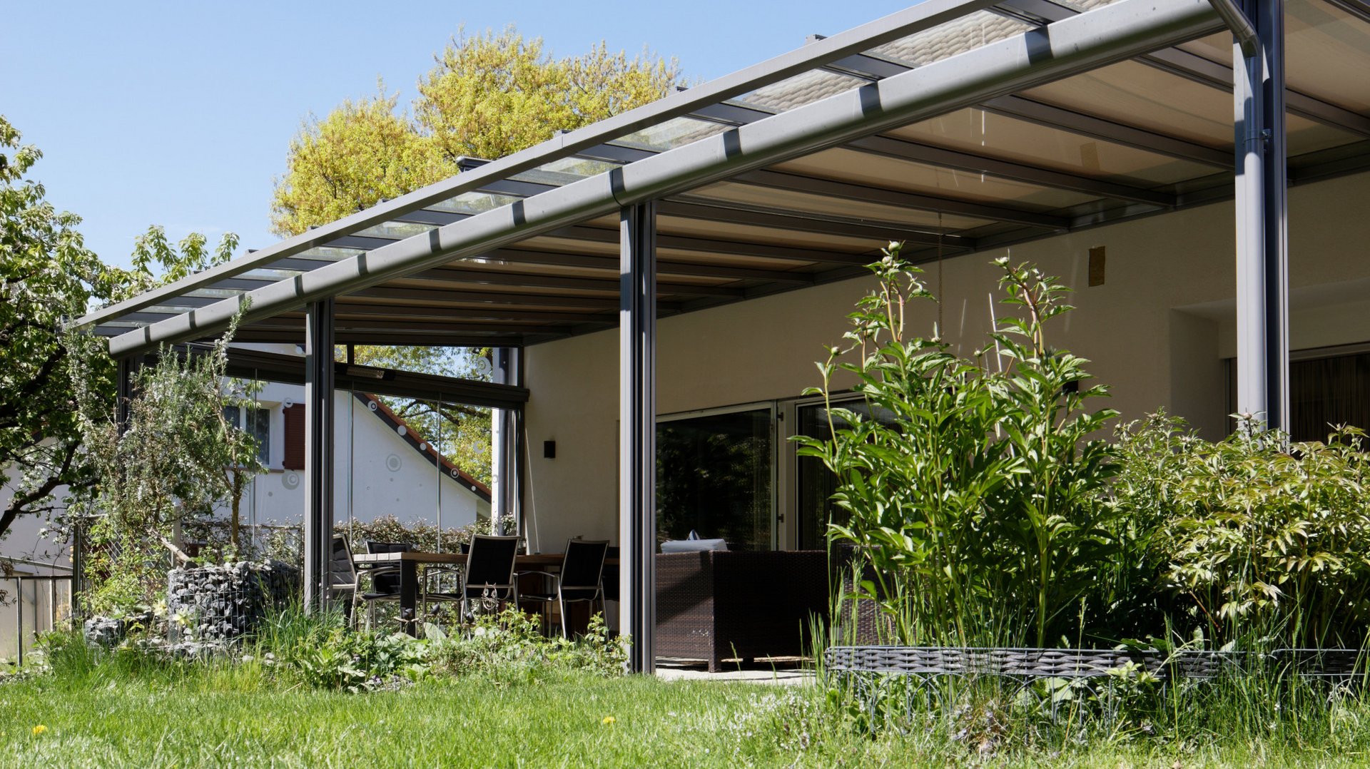 Our terrace roof is a paradigm of glass roofs. The transparent glass roof is attached to the house wall providing an unobstructed view upward, without blocking the natural light coming into your living space. It is an ideal form of permanent all-weather protection, under which furniture and BBQs can be stored all year round. On hot summer days, the canopy awning creates wonderfully cool and shaded areas. The delicate yet sturdy terrace roof fits in beautifully with the most diverse styles of architecture. It is also ideally suited for small to medium-sized garden seating areas and roof terraces. The dimmable LED lighting and vertical fabric blinds down the sides create the perfect lounge feeling.