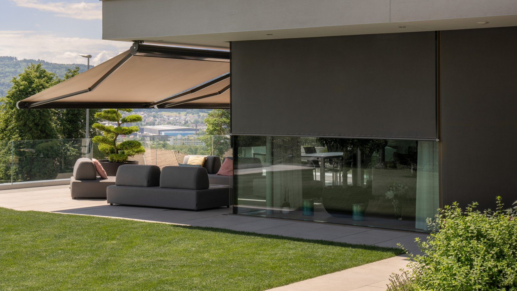 There is a whole range of options on offer for the vertical fabric blind so it can best satisfy your needs and desires. Countless fabric designs and a wide selection of colours for the frames help you create a beautiful look for your facade, balcony and terrace. For even more comfort, our products can be controlled using our clever Smart Home solutions. With our wide selection of sensors for the sun, wind and rain, you can be assured of a safe operation in perfect synch with your product. Always with you: Swiss quality.