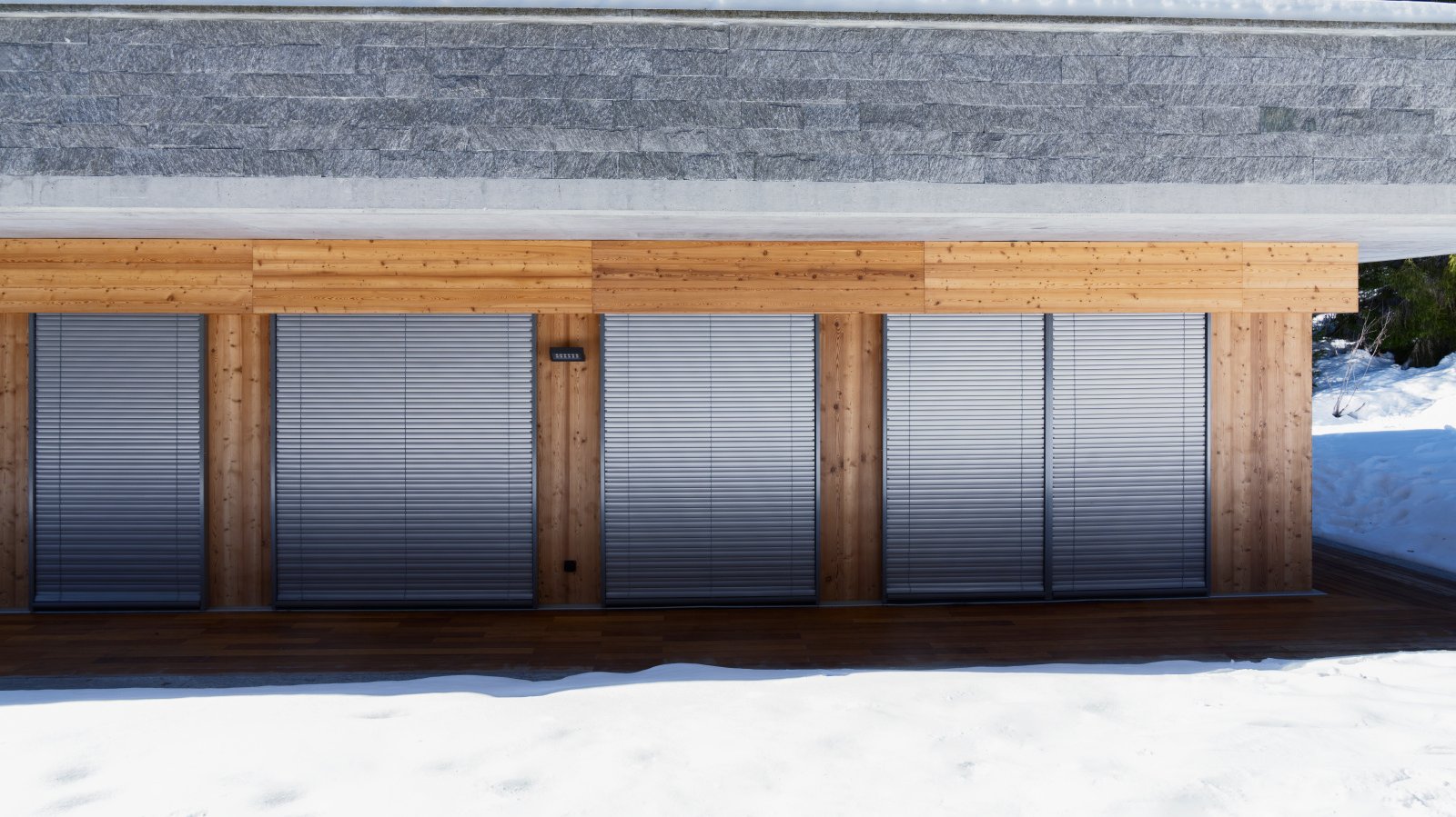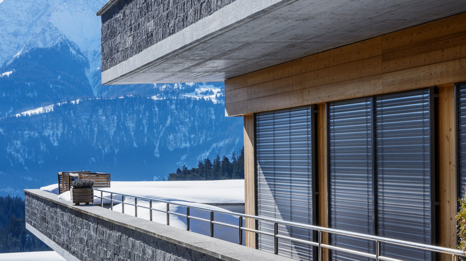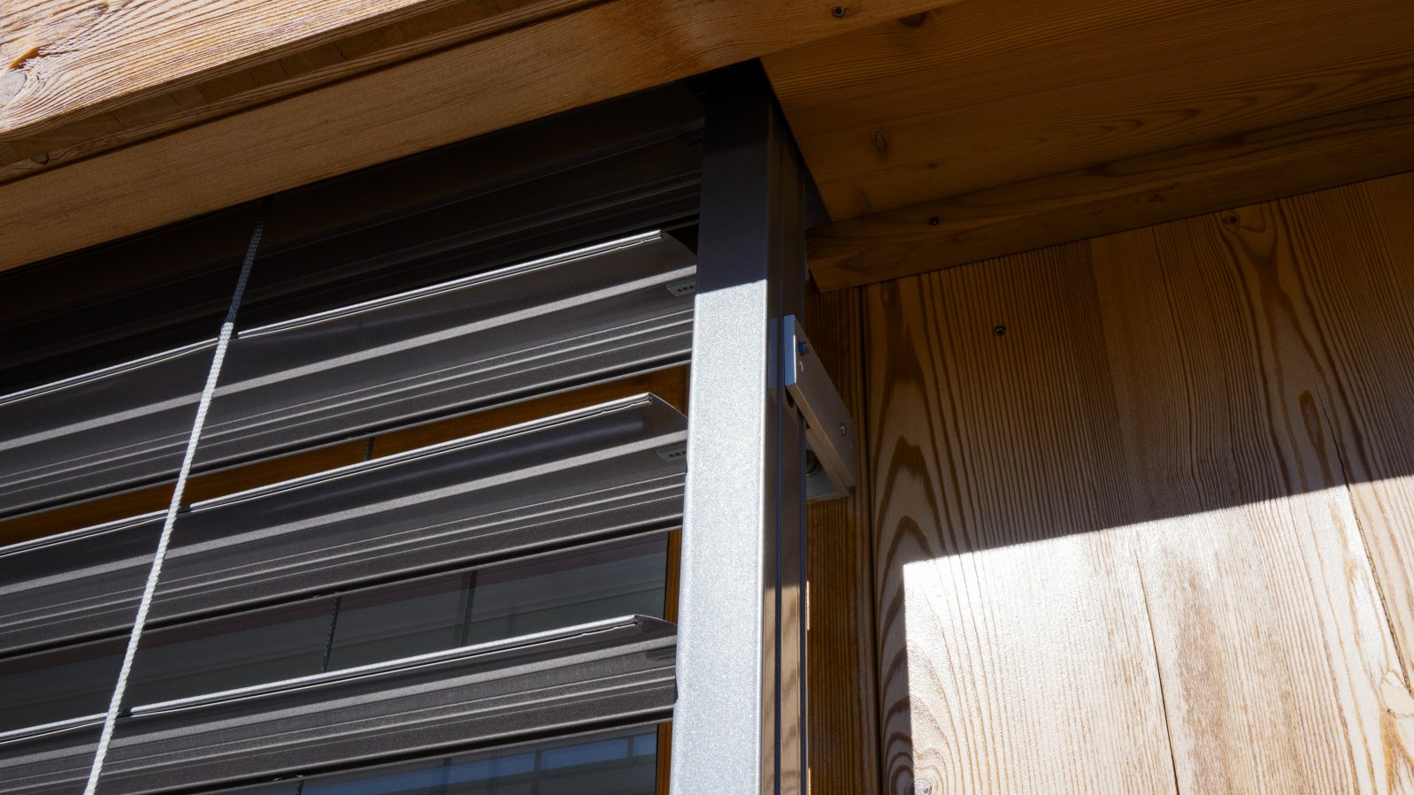 The metal compact venetian blind MV 90 is used to complement the luxury look of the apartment – a sophisticated shading system capable of meeting high demands. The high-quality, low-maintenance toothed belt guide is integrated in the guides on the side. Because a lifting cord is not threaded through the slats, it provides maximum darkening and heat insulation. Thanks to the special shape of its slats, the metal compact venetian blind can freely and accurately control the amount of light let in. The grey aluminium of the slats blends in with the natural stone and wooden facades. The location of the apartments at the edge of the forest offers a lot of peace and quiet, and privacy. This is a great advantage of the local surroundings. Since they are holiday apartments, a lot more attention was given to break-in protection. This is another reason why the MW 90 is the perfect choice. It can be locked in every intermediate position thanks to its anti-lift device. Together with a special slat guide, it satisfies increased security requirements thanks to its active locking technology.