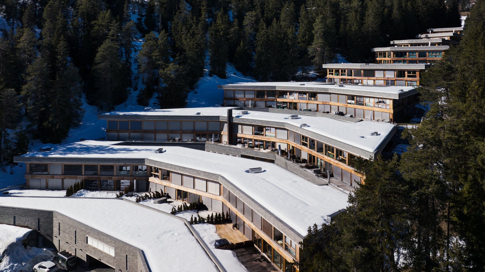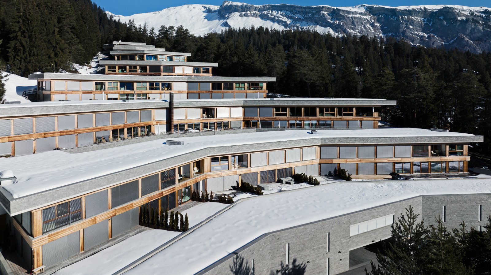 The dreamlike holiday apartment building sits high above Laax-Murschetg. It has 94 apartments across 15 floors, and one of the ways it can be accessed is in an inclined lift. Terraced into the landscape and facing south, the complex is outstanding with its unbeatable views and sun-drenched apartments. The elegant architecture reflects the natural characteristics of its surroundings using high-quality materials such as natural stone and larch.