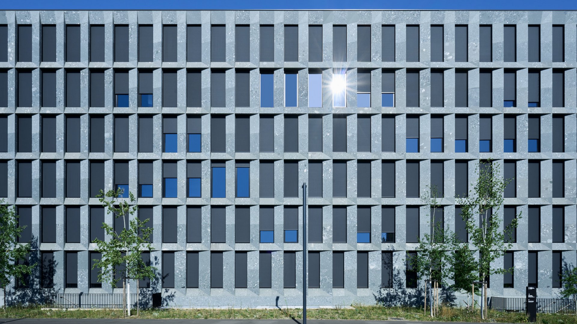 The wind-stable vertical fabric blind VSe ZIP is a popular choice for shading systems in public buildings, as well as apartment buildings and single-family homes, because it combines functionality and aesthetics at the highest level. There are 436 fabric designs to choose from for the translucent fabric of this blind variant. The colour Mermet Satiné 5500, COL 3030, Charcoal was used for the fabric blinds of the PJZ. The colour of the powder-coated front-mounted boxes, front, profile guides and colour profiles can be colour-coordinated with the fabric to create a uniform look.
