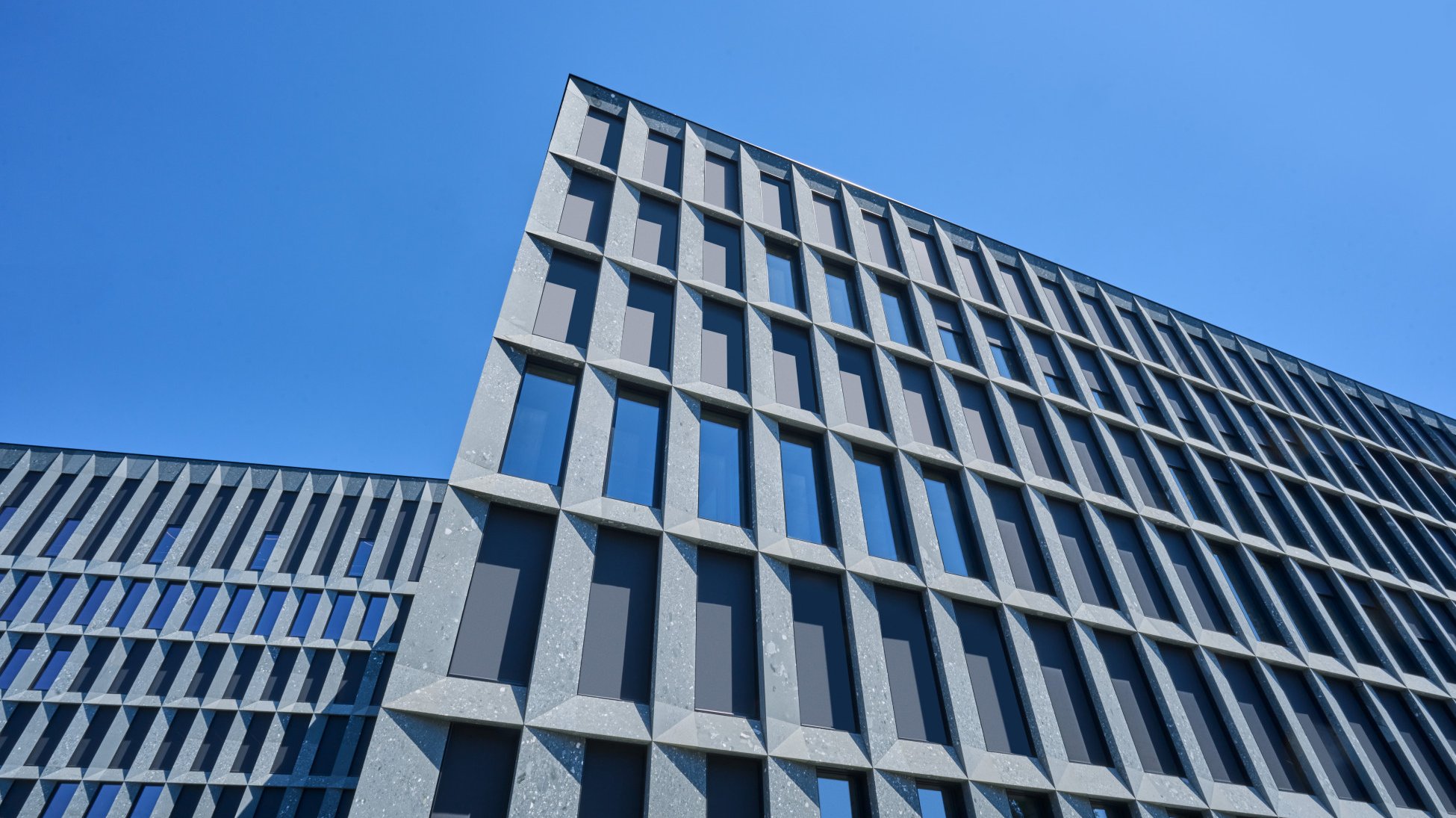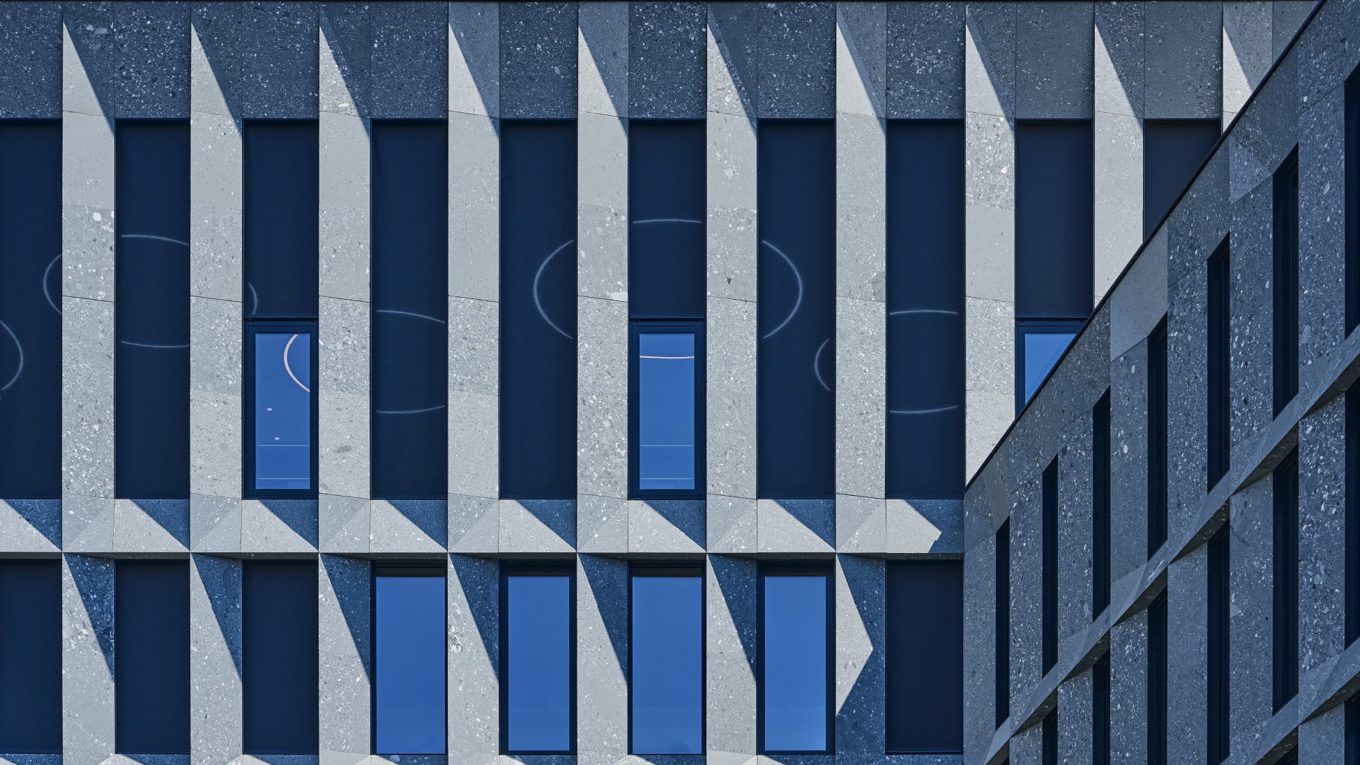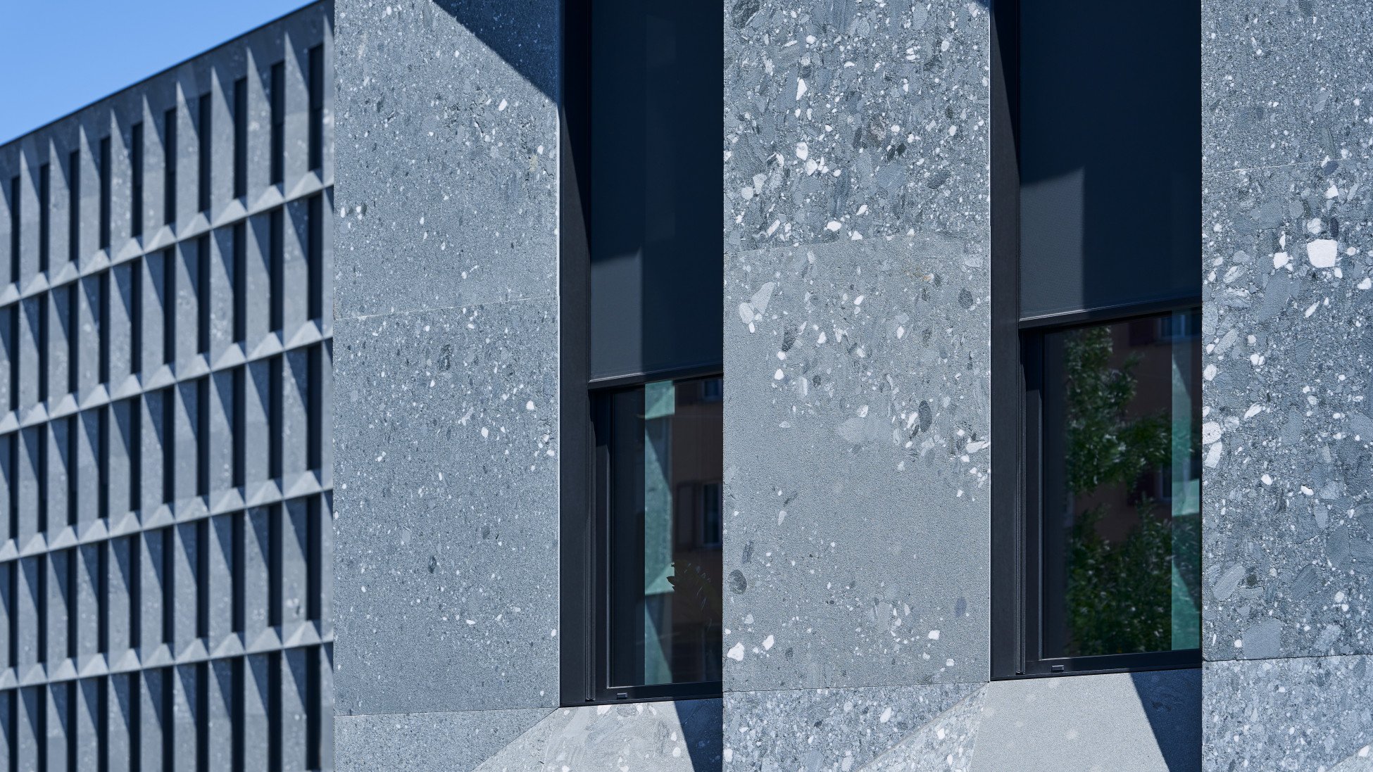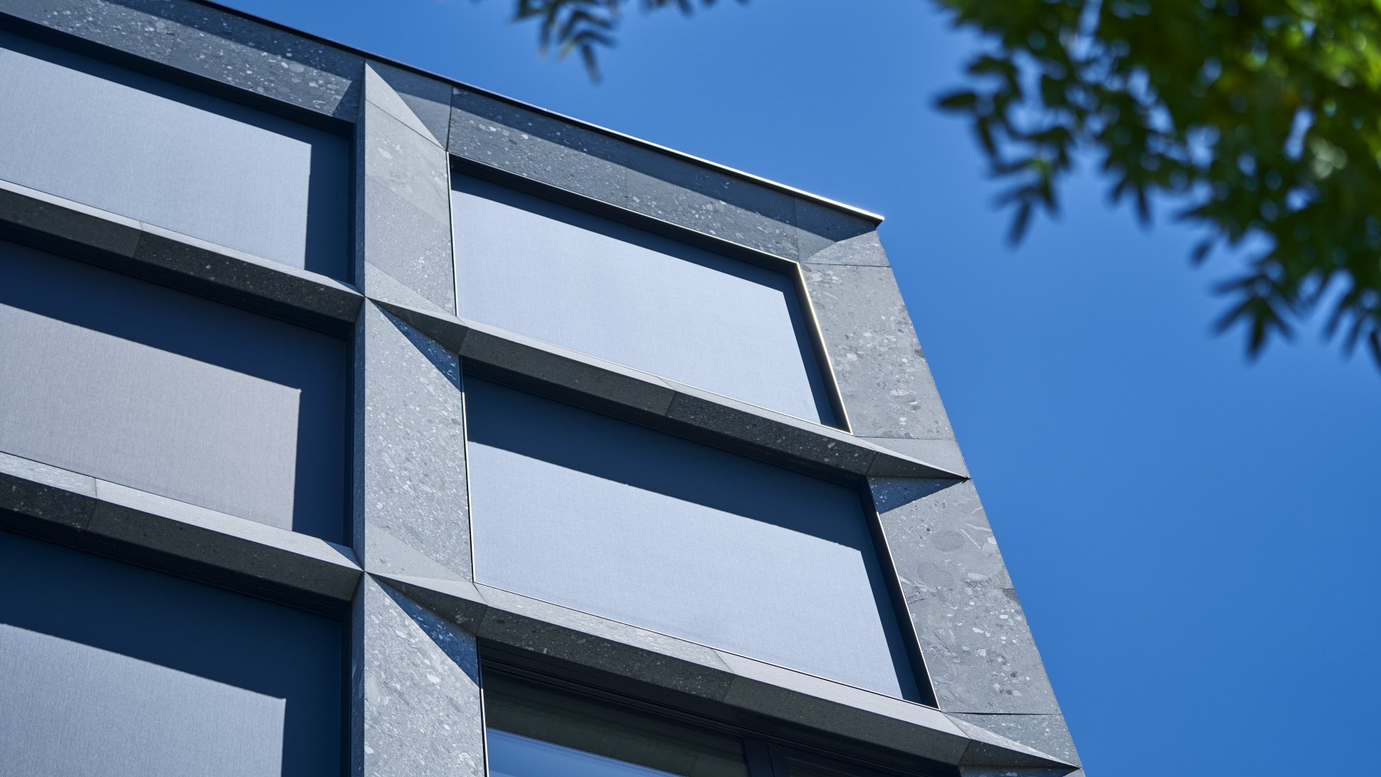 The vertical fabric blinds are either fully or only somewhat in use, depending on the time of day. On a sunny day, they cover all the openings on the sun-exposed sides of the building, while on other facades they are only lowered in part. On the sides devoid of all sun, they are fully retracted into the soffit of the black metal frames to reveal the window glazing. The varying appearance of the facades visible from Hohlstrasse stems from this combination of fabric blinds and glazing, with the building material itself. The architects chose Vert de Salvan for the facades – a greenish grey natural stone from Valais. The sedimentary rock creates a varied look with its mineral inclusions of all sizes and colour nuances. From afar it looks uniform, but up close, its diversity comes alive. The vertical fabric blinds complement the green hue of the facade covering. They are charcoal in colour – a shade between dark grey and black. The fabric itself is a screen fabric that provides excellent thermal insulation and a clear view to the outside. In addition to the 3'200 vertical fabric blinds, Schenker Storen made 300 reef venetian blinds, type KR 80, for the windows overlooking the seven courtyards. Functionality and aesthetics work in harmony here giving the PJZ its powerful appearance at the heart of Zurich.