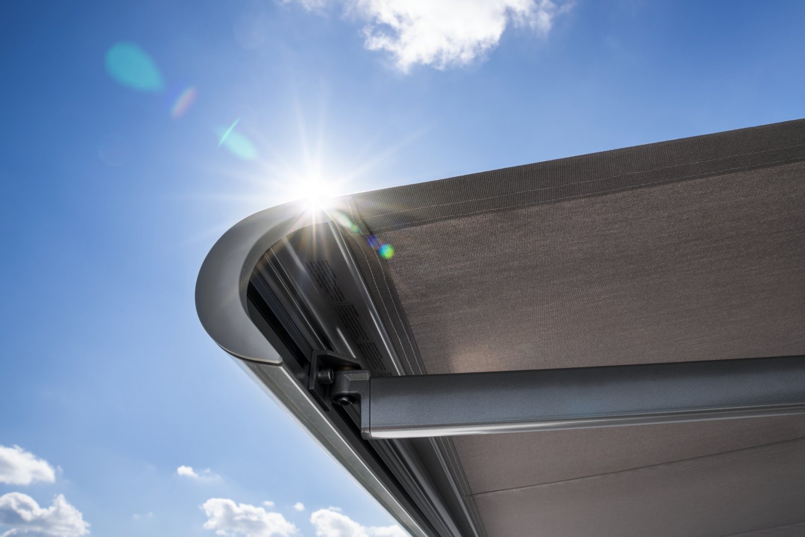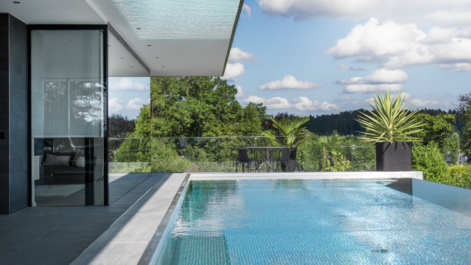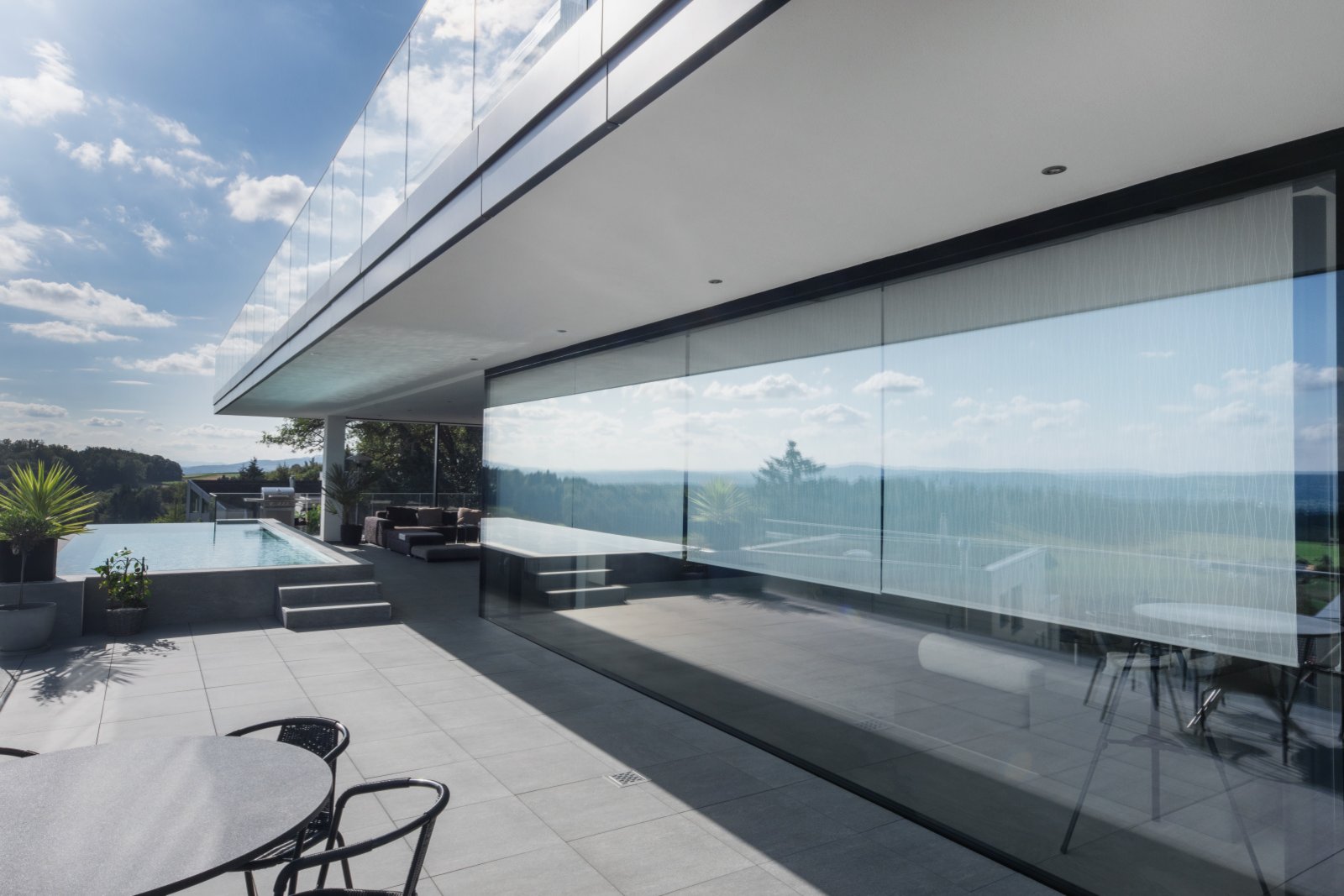 The customised shading system was developed working closely together with the architects. That is how, for example, we were able to install a recessed rollable blind system in the ceiling for the wraparound full-height glazing in the living room and still fulfill all the demands for technical perfection, safety and ease of use. Six rollable blinds had to be installed next to each other to cover the expanse. The colour scheme was likewise perfectly matched with the interior decor. The slightly transparent fabric used in the rollable blind provides a clear view outside during the day and conceals the black glass pane at night. Jointly with the lighting concept, this creates a particularly pleasant atmosphere. Compact venetian blinds are installed in all the bedrooms. High-quality cassette awnings on the south-facing side provide shading on the wraparound roof terraces, while the covered terraces on the ground floor are equipped with wind-stable vertical fabric blinds. These keep the wind out and provide glare protection when the sun is low in the evening sky. Plus, all the shading systems can be conveniently controlled using the Smart Home app on your tablet or mobile phone. Because the external shading units are connected with the weather station, they automatically retract when the wind speed starts to pick up.