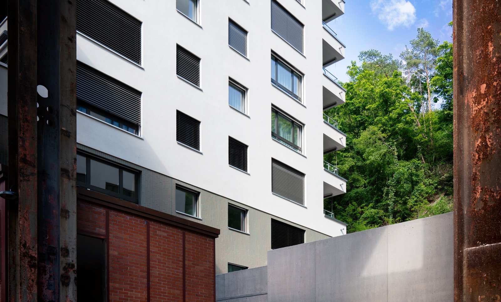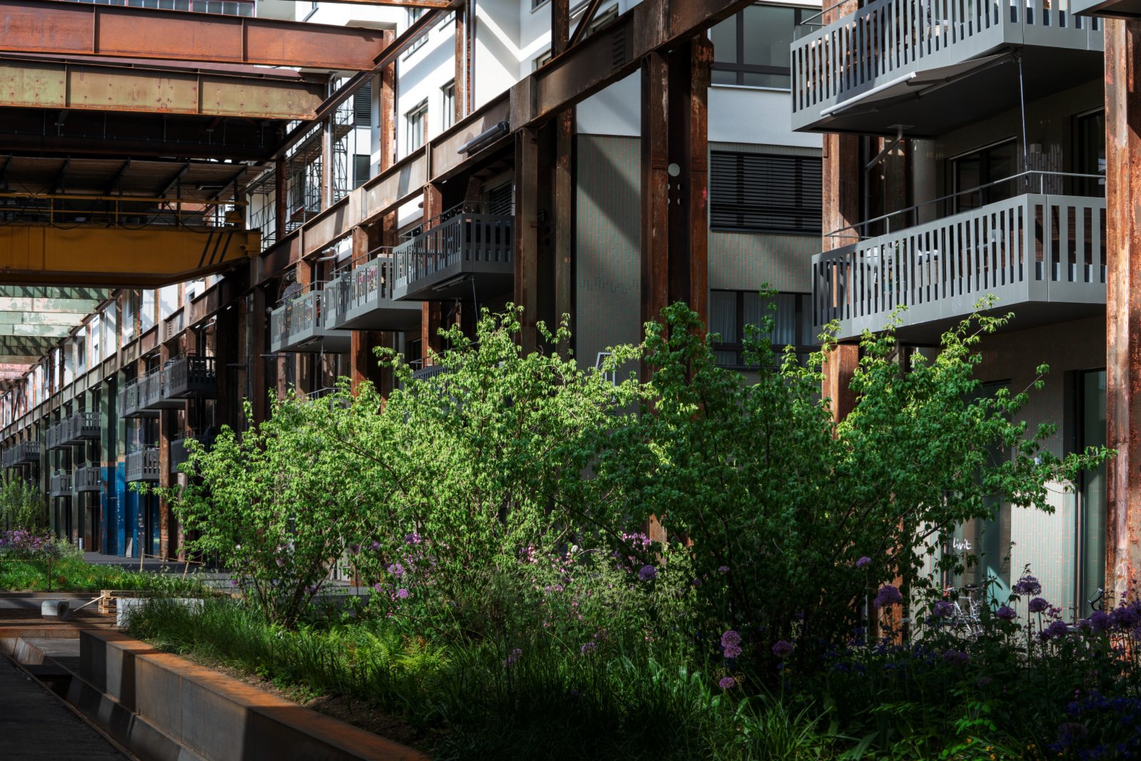 The furnaces at Georg Fischer’s steel foundry went cold long ago, back in 1991, and have not been used since, making it the largest disused industrial hall in Switzerland. Measuring over 300 meters in length, it is one of the most prominent testaments to the industrial boom, far beyond the confines of the Canton of Schaffhausen. What makes this steel foundry so special are its impressive dimensions and how it faithfully follows the clear lines of a distinct architectural form. This is how three out of the four halls were retained. It became apparent early on that the 24-meter-long hall should be transformed into an public park from which all the other areas would stem. The roof of the hall is alternately open or covered. The new architecture weaves itself into the historical fabric. The enormity of the steel construction is not the only breathtaking feature; the high vertical windows facing Mühlentalstrasse convey a sense of divine awe through their sheer size.